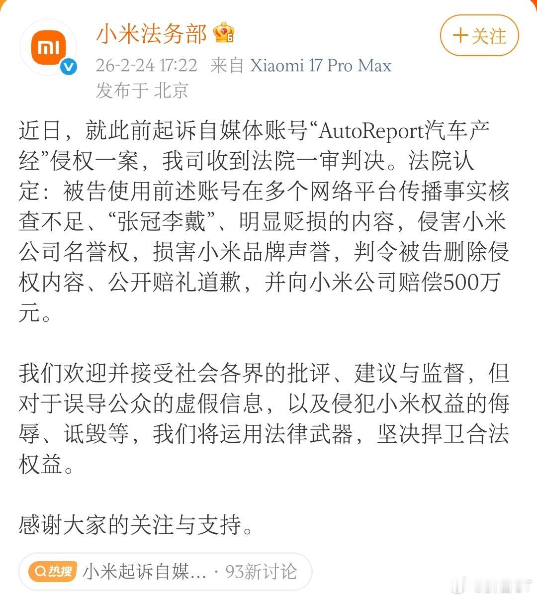 小米起诉自媒体获赔500万