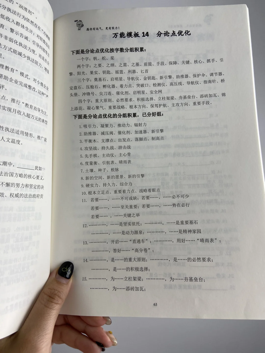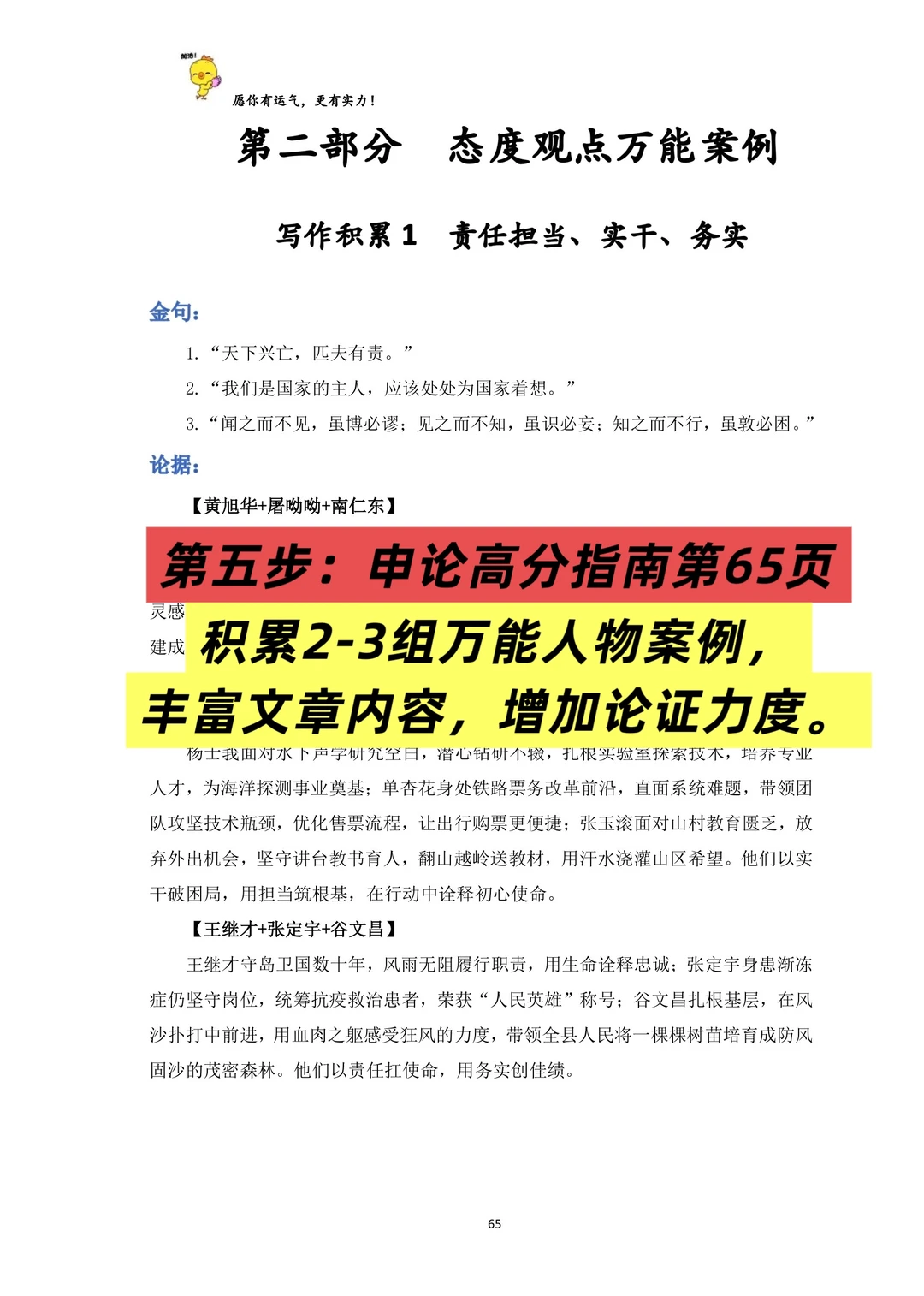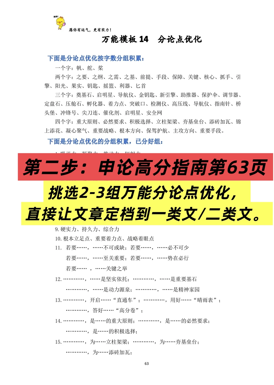 ✅现在已经不是裸考的时代了,但是也不到该放弃的时候,用好这五步走,至少保证一个平均上边一点的成绩是没问题的,大家加油呀!! 1️⃣第一步: 《申论高分指南》的第64页,挑选2-3个万能的标题优化框架,给考官留下一个好的印象。 2️⃣第二步: 《申论高分指南》第63页,挑选2-3组万能分论点优化词,直接在文章定档的时候,就靠着分论点优化争取定到二类文上的水平。推荐序号11-15之间进行挑选。 3️⃣第三步: 《申论高分指南》第3页,积累一下13个不同话题的万能开头和结尾,这样考场上面对大多话题,都是能够有的写的,头开好了,心就不慌了。 4️⃣第四步: 《申论高分指南》第3页开始,积累一下过渡句和例证法,例子的记忆点更强,比道理更好记忆,考前尤其推荐看一下例子,不推荐看道理,如果备考时间富裕,再把道理看一下。 5️⃣第五步: 《申论高分指南》第65页,积累2-3组万能的案例,就能覆盖20个不同的话题,能够丰富文章的内容,增加论证力度。 PS:如果还有精力的同学,可以把指南第二册的论据看一看,实在没时间的同学,前五个步骤搞定就好,加油加油!!