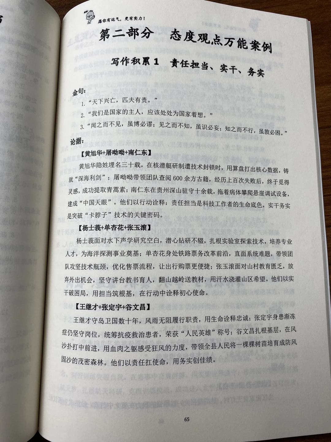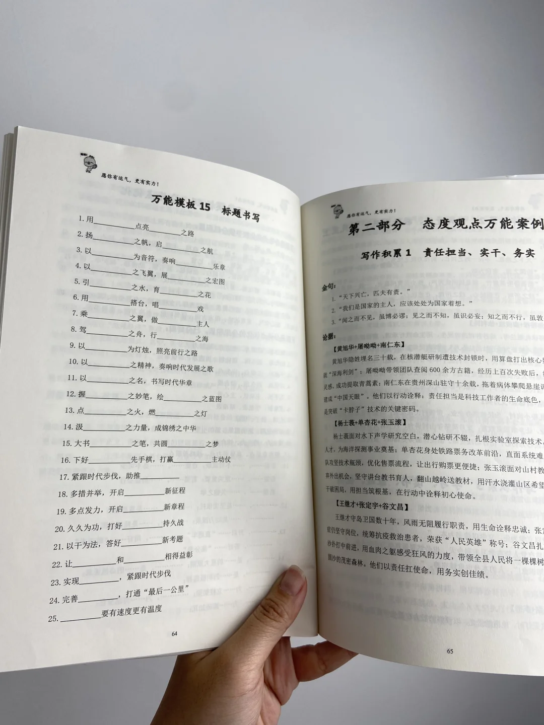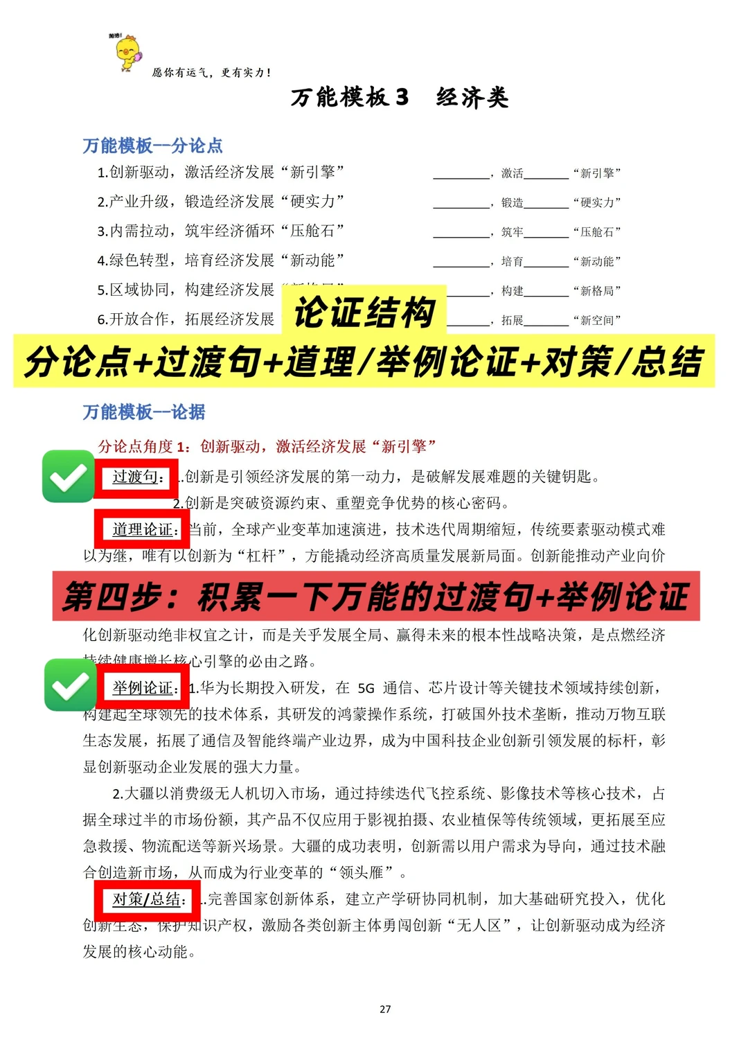 ✅现在已经不是裸考的时代了,但是也不到该放弃的时候,用好这五步走,至少保证一个平均上边一点的成绩是没问题的,大家加油呀!! 1️⃣第一步: 《申论高分指南》的第64页,挑选2-3个万能的标题优化框架,给考官留下一个好的印象。 2️⃣第二步: 《申论高分指南》第63页,挑选2-3组万能分论点优化词,直接在文章定档的时候,就靠着分论点优化争取定到二类文上的水平。推荐序号11-15之间进行挑选。 3️⃣第三步: 《申论高分指南》第3页,积累一下13个不同话题的万能开头和结尾,这样考场上面对大多话题,都是能够有的写的,头开好了,心就不慌了。 4️⃣第四步: 《申论高分指南》第3页开始,积累一下过渡句和例证法,例子的记忆点更强,比道理更好记忆,考前尤其推荐看一下例子,不推荐看道理,如果备考时间富裕,再把道理看一下。 5️⃣第五步: 《申论高分指南》第65页,积累2-3组万能的案例,就能覆盖20个不同的话题,能够丰富文章的内容,增加论证力度。 PS:如果还有精力的同学,可以把指南第二册的论据看一看,实在没时间的同学,前五个步骤搞定就好,加油加油!!