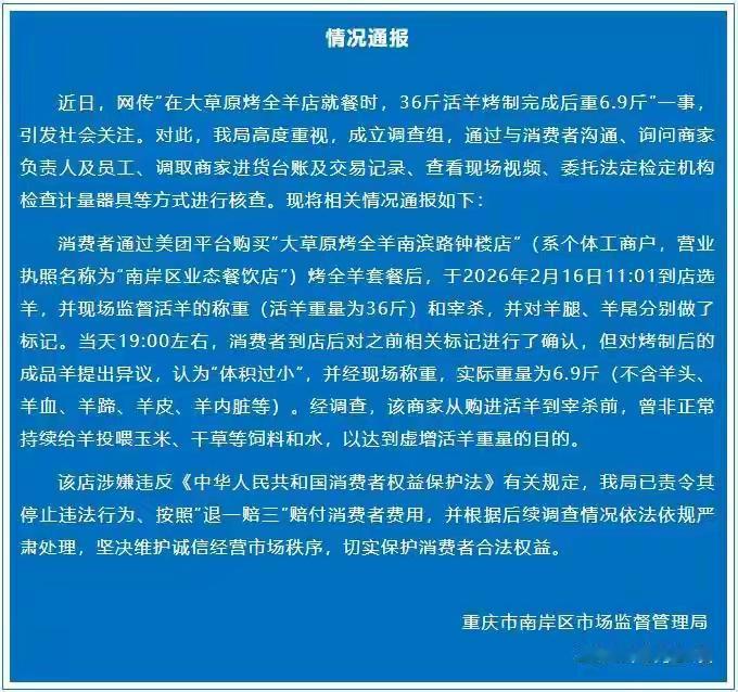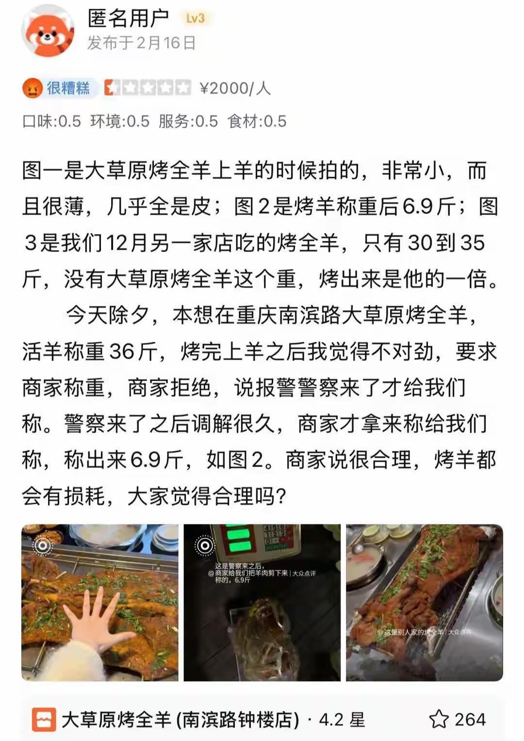 “36斤活羊烤完仅6.9斤”系餐馆非正常投喂增重,记者现场实探:店内无顾客,店员锁门称对此事不知情 “36斤活羊烤完仅6.9斤”系餐馆非正常投喂增重,记者现场实探:店内无顾客,店员锁门称对此事不知情——这背后到底隐藏着怎样的秘密? 一只36斤的活羊,经过烤制后竟然只剩下6.9斤?这组数字一经曝光,瞬间点燃了网友的愤怒和质疑。难道餐馆用“魔法”把30多斤的肉变成了不到7斤的“空气”?背后的真相远比我们想象的复杂,也更让人心寒。 记者第一时间赶到现场,却发现店内冷冷清清,连一个顾客的影子都没有。更诡异的是,当记者试图询问时,店员竟然直接锁上门,声称“对此事不知情”,仿佛这件事与他们毫无关联。这种态度,难免让人怀疑餐馆是否在刻意回避什么。 深入调查后,我们发现,这家餐馆为了“增重”羊只,竟然采用了非正常的投喂手段。也就是说,羊在被宰杀前被强行喂食大量水分和不易消化的物质,导致体重虚增,但真正可食用的肉质却大打折扣。这样的做法,不仅欺骗了消费者,更严重威胁到了食品安全和公众健康。 这件事暴露出一个更深层次的问题:在利益驱动下,一些餐饮商家不惜铤而走险,用各种“猫腻”来牟利,完全无视消费者的知情权和健康权。我们作为消费者,面对花了钱却买不到应有价值的商品,心中难免愤怒和无奈。 更令人担忧的是,这样的现象并非个例,而是行业中存在的普遍隐患。我们每个人在外就餐时,是否都可能成为“缩水肉”的受害者?这不仅仅是一个餐馆的问题,而是整个市场监管和诚信体系的警钟。 这起事件引发了广泛讨论:我们是否应该更加关注食品安全,要求更严格的监管?作为消费者,我们又该如何保护自己的权益?面对这些“缩水肉”的背后黑幕,你是否也想大声喊出:“够了,我们要真相!” 别急,接下来我们将带你揭开更多细节,告诉你如何识别“缩水肉”,以及如何用实际行动让这些不良商家无处遁形。你准备好了吗?让我们一起深入探讨,守护餐桌上的每一份安心。