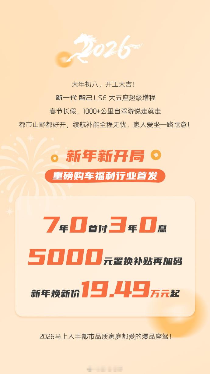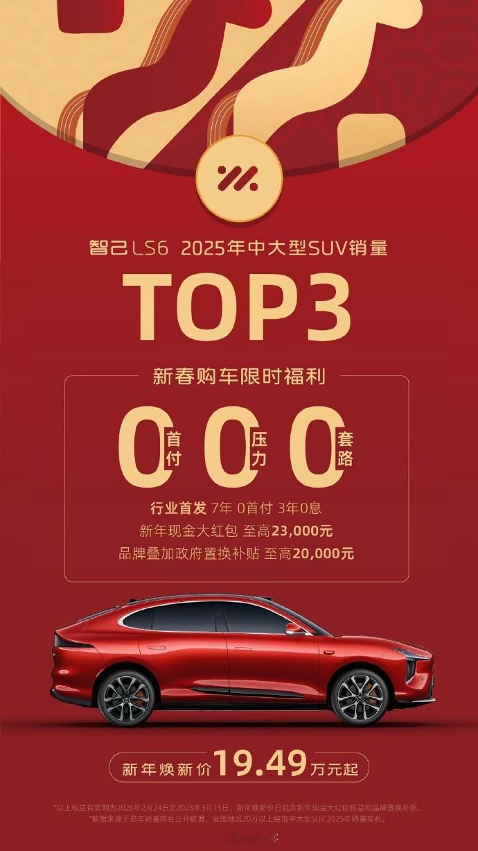 全新一代智己LS6可享7年0首付3年0息政策,同时还拥有5000元置换补贴,新车在新年的焕新价仅19.49万元起。