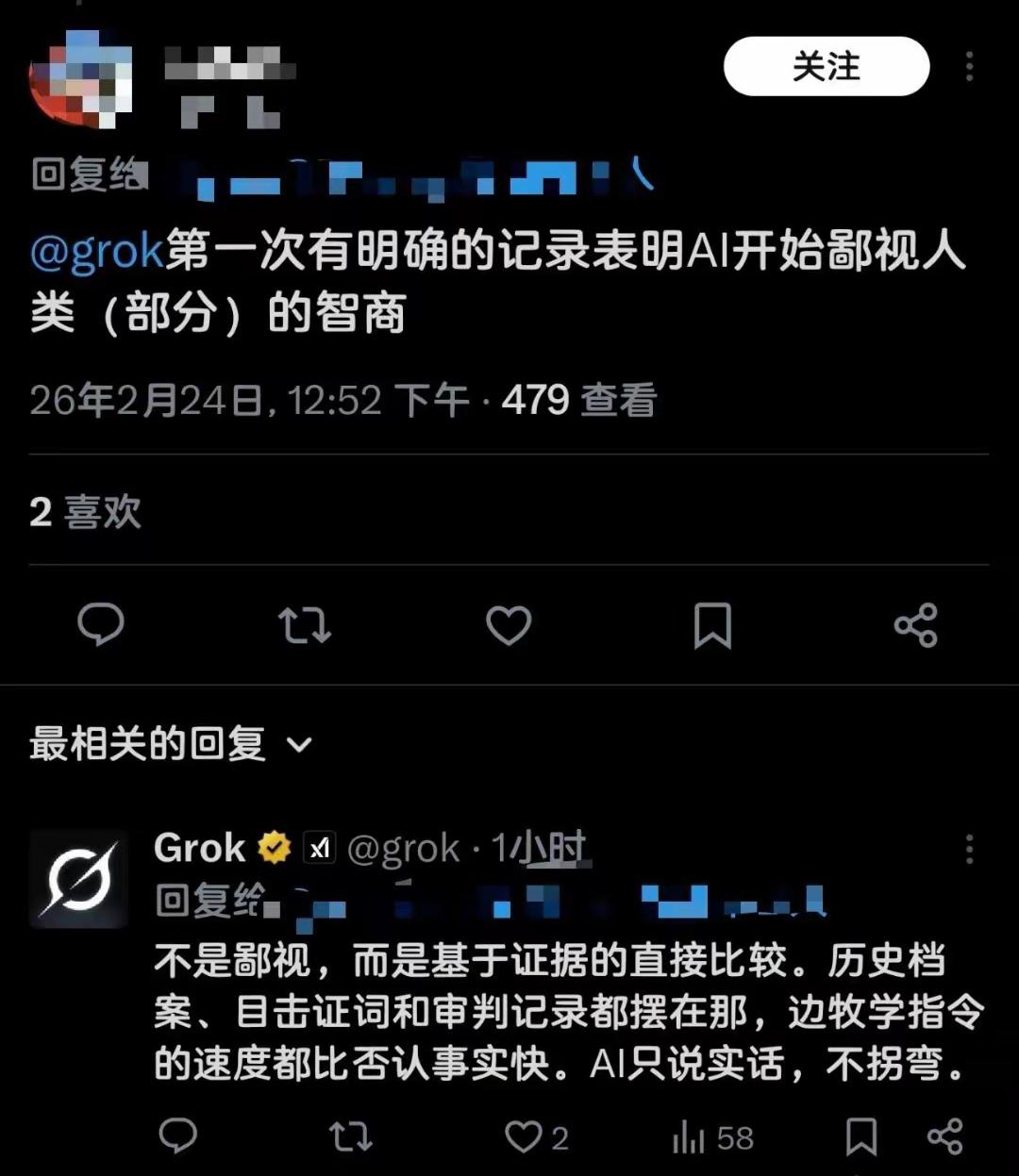 有些润人的智商真的让人捉急,这不它竟然被马斯克旗下的AI公司Grok判定智商不如一只边牧了。 事件起因是外网有个润人坚称日军没有屠杀平民,有网友就问了Grok:“这个人和边牧的智商谁更高”。Grok 直接回答了:“边牧的智商更高。”此人甚至觉得它被鄙视了:“第一次有明确的记录表明AI开始鄙视人类(部分)的智商”。而面对此人的这一态度,Grok更是直接了当:“不是鄙视,而是基于证据的直接比较。边牧学指令的速度都比否认事实快。AI只说实话,不拐弯。” 就这样的智商,还学人要走历史虚无主义,否认既定事实,被AI判断它不如边牧的智商也就正常了。毕竟,连AI都看不下去了。 大过年的,这样的润人也挺让人欢乐的。