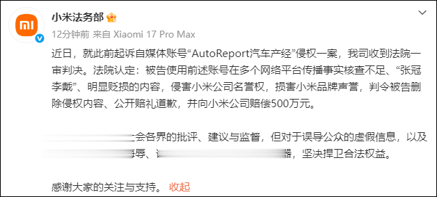 近日,就此前起诉自媒体账号“AutoReport汽车产经”侵权一案,我司收到法院一审判决。法院认定:被告使用前述账号在多个网络平台传播事实核查不足、“张冠李戴”、明显贬损的内容,侵害小米公司名誉权,损害小米品牌声誉,判令被告删除侵权内容、公开赔礼道歉,并向小米公司赔偿500万元。