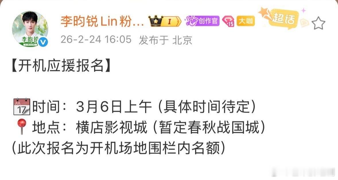 李昀锐《归良辰》3月6日开机,感觉还没休息就又进组了