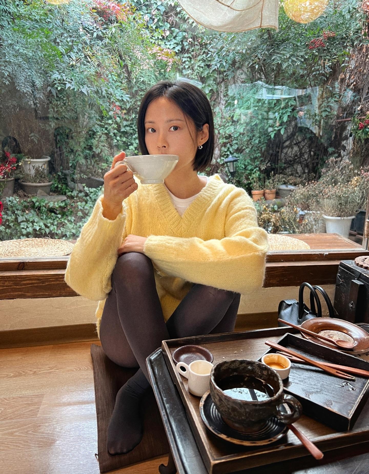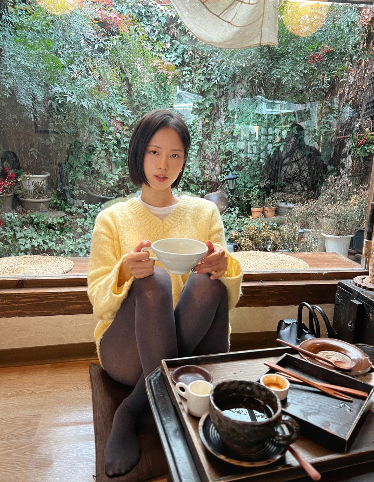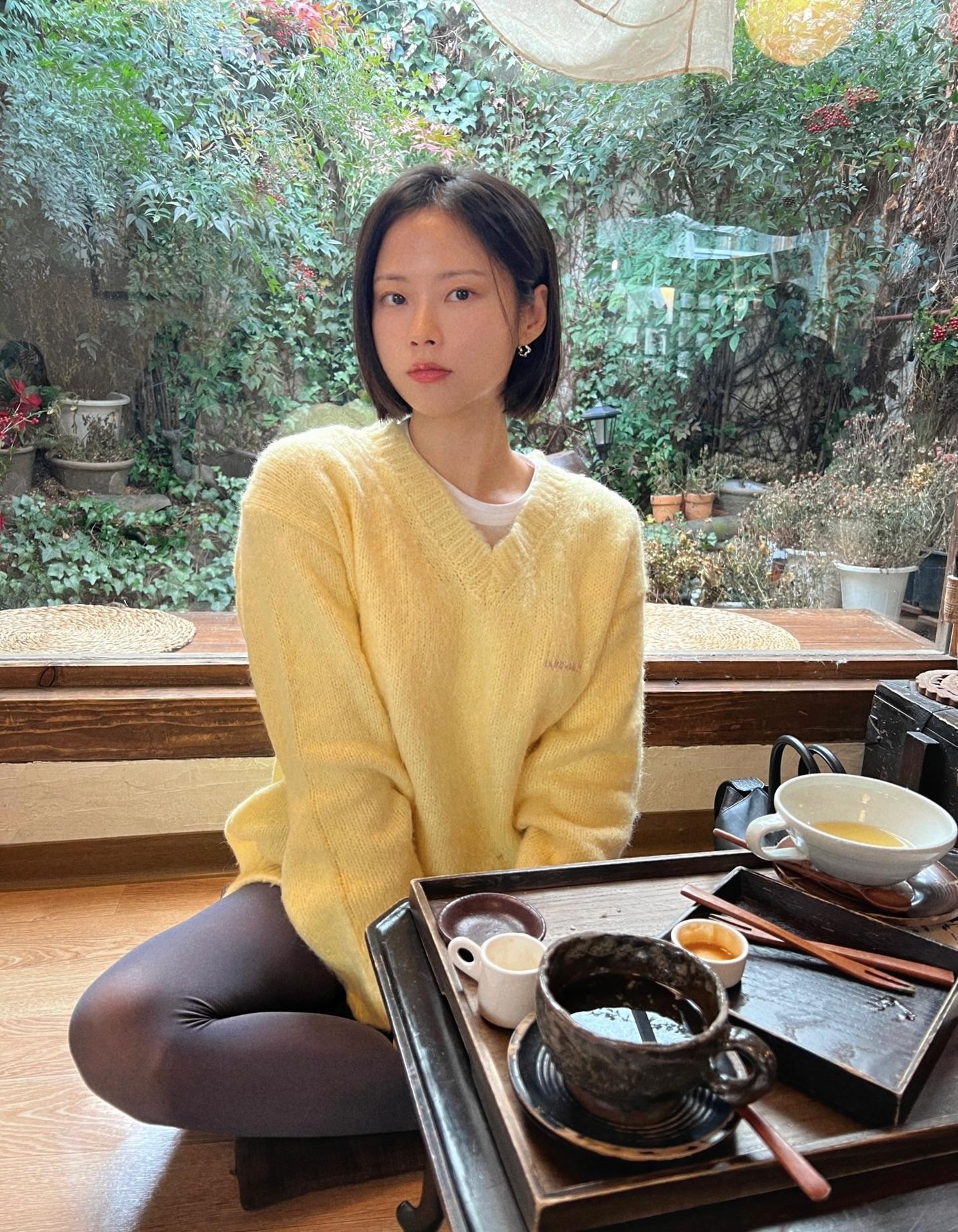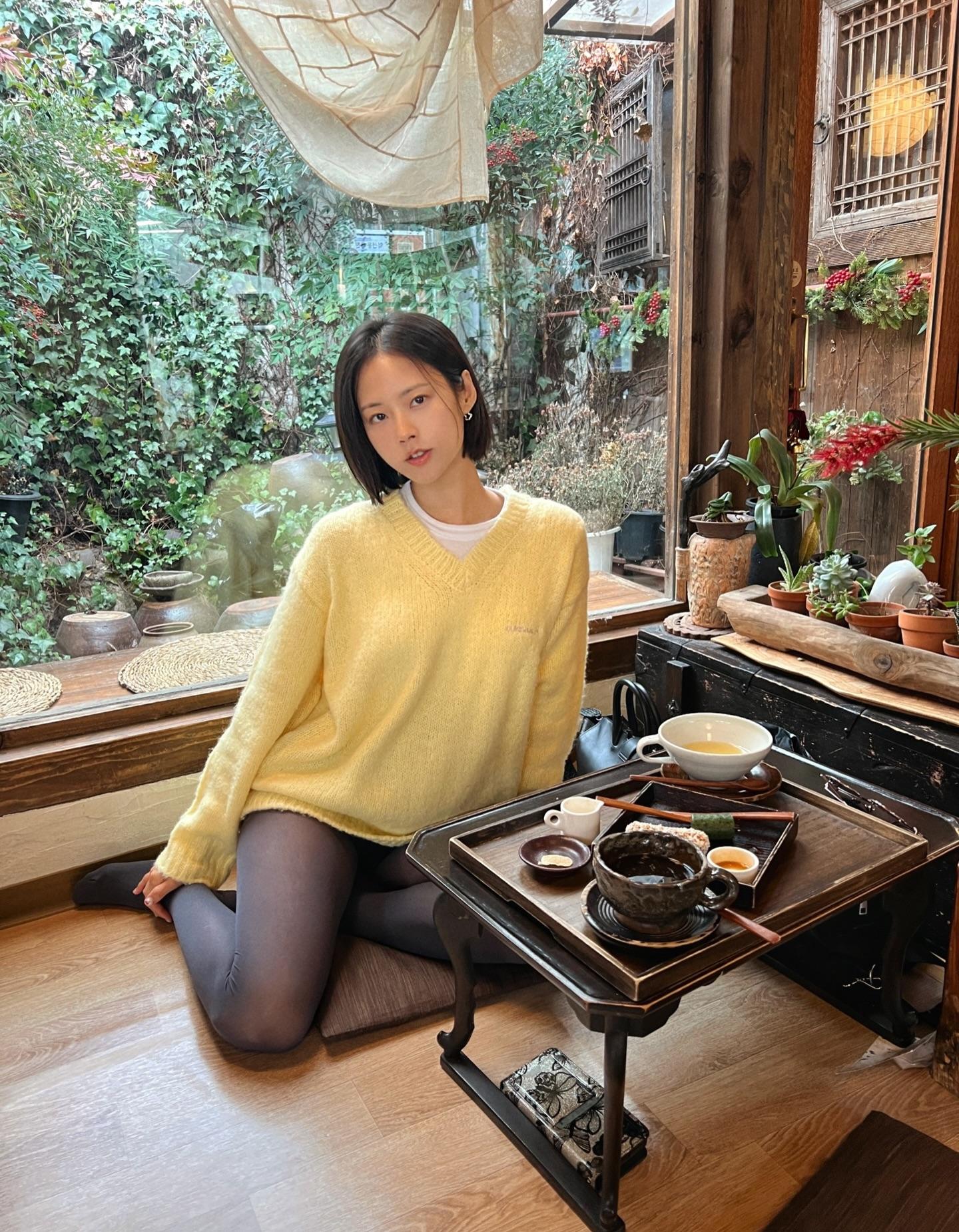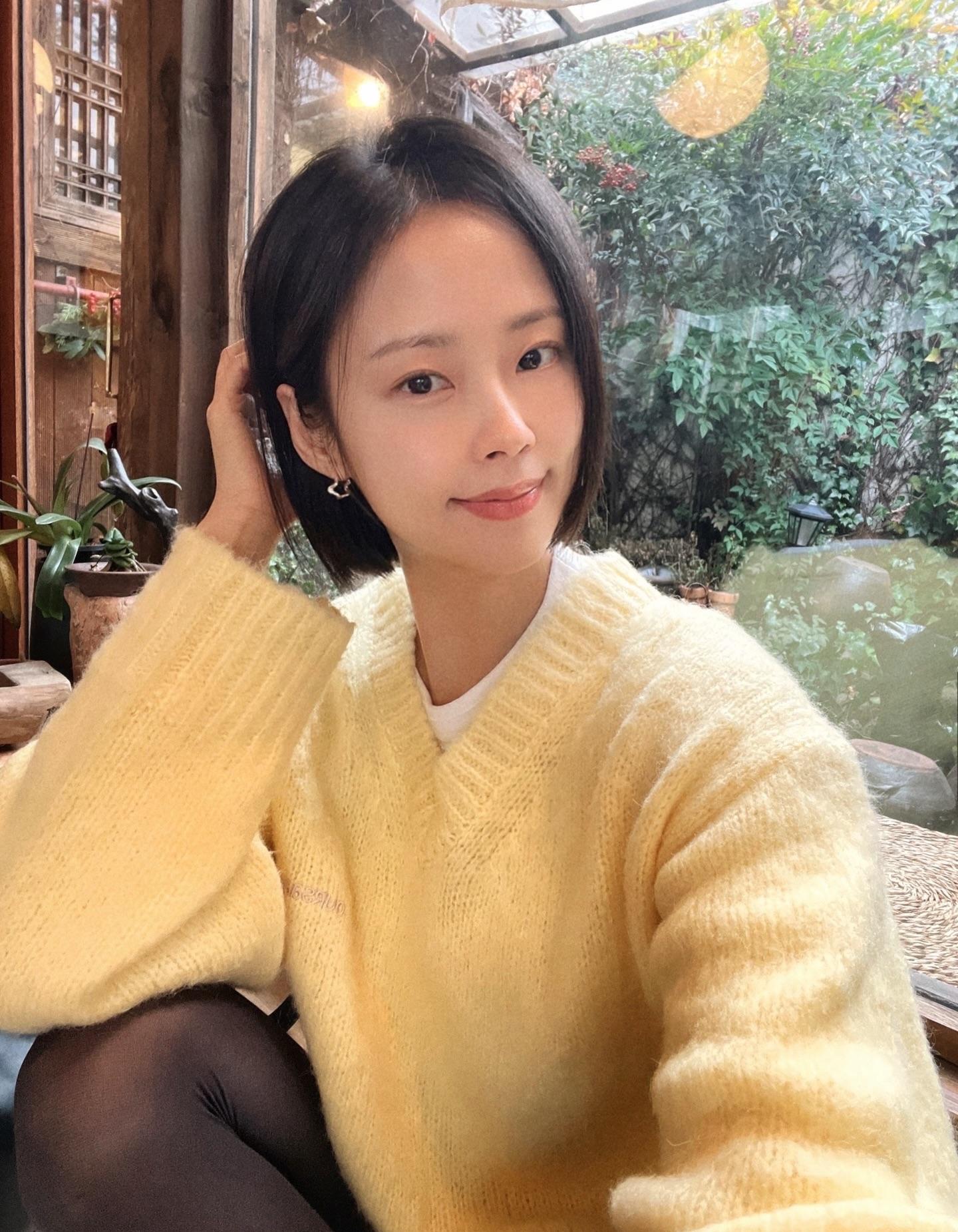 分享照片 美女随拍 黄色毛衣 短发 知性女人