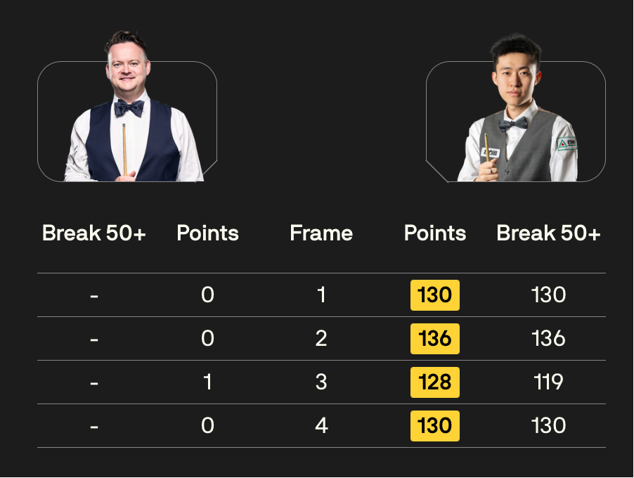 直播吧02月24日讯2026斯诺克威尔士公开赛64进32轮次,中国选手常冰玉打出四杆破百(130、136、119、130),以4-0的比分战胜肖恩·墨菲晋级32强,墨菲全场仅得1分!