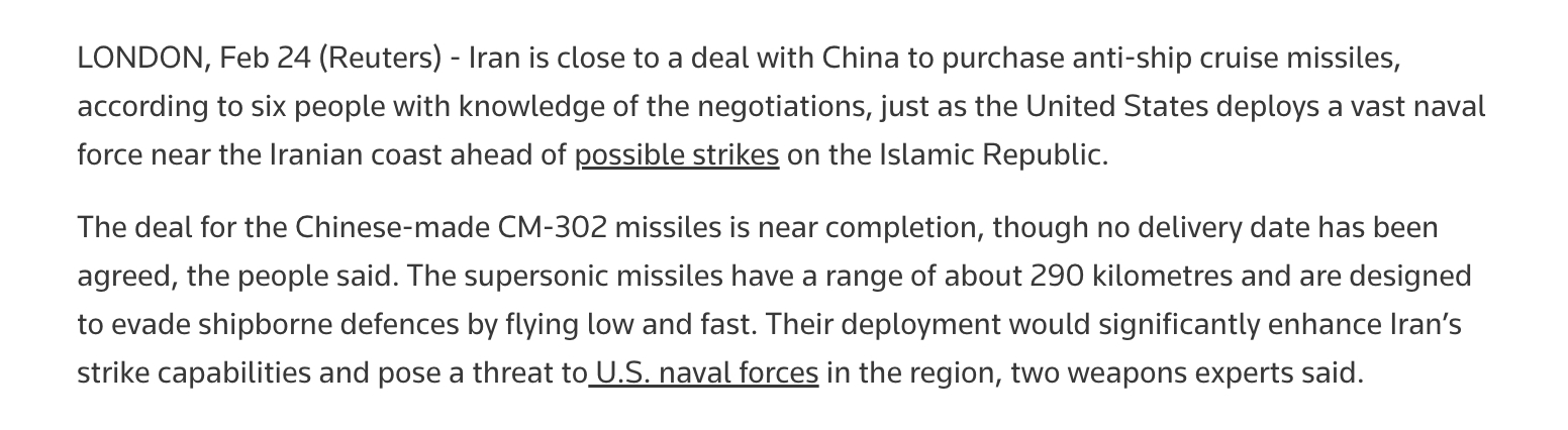 2月24号,根据路透社报道的消息,伊朗已经接近与中方达成一项协议,购买中方制造的