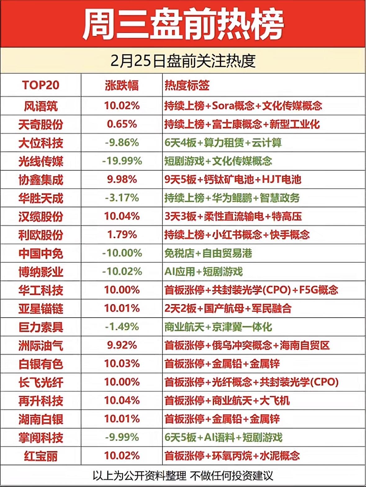 2月25日盘前热榜里风语筑、天奇股份等强势上榜,这里面投资机会可不少。就说天奇股份,现价35.64元,历史高点39.83元,属于人形机器人和银河通用领域。它和春晚“武BOT”背后的银河通用深度绑定,是其工业场景唯一落地伙伴,还布局了AI大模型+机器人应用,已和富士康敲定5年部署2000台具身智能机器人目标,确认收入近8亿。风语筑现价11.68元,历史高点23.90元,业务涵盖传媒、人形机器人领域,在行业创新和应用场景拓展趋势下,股价上升空间大。这两只股感觉都有潜力,值得关注。