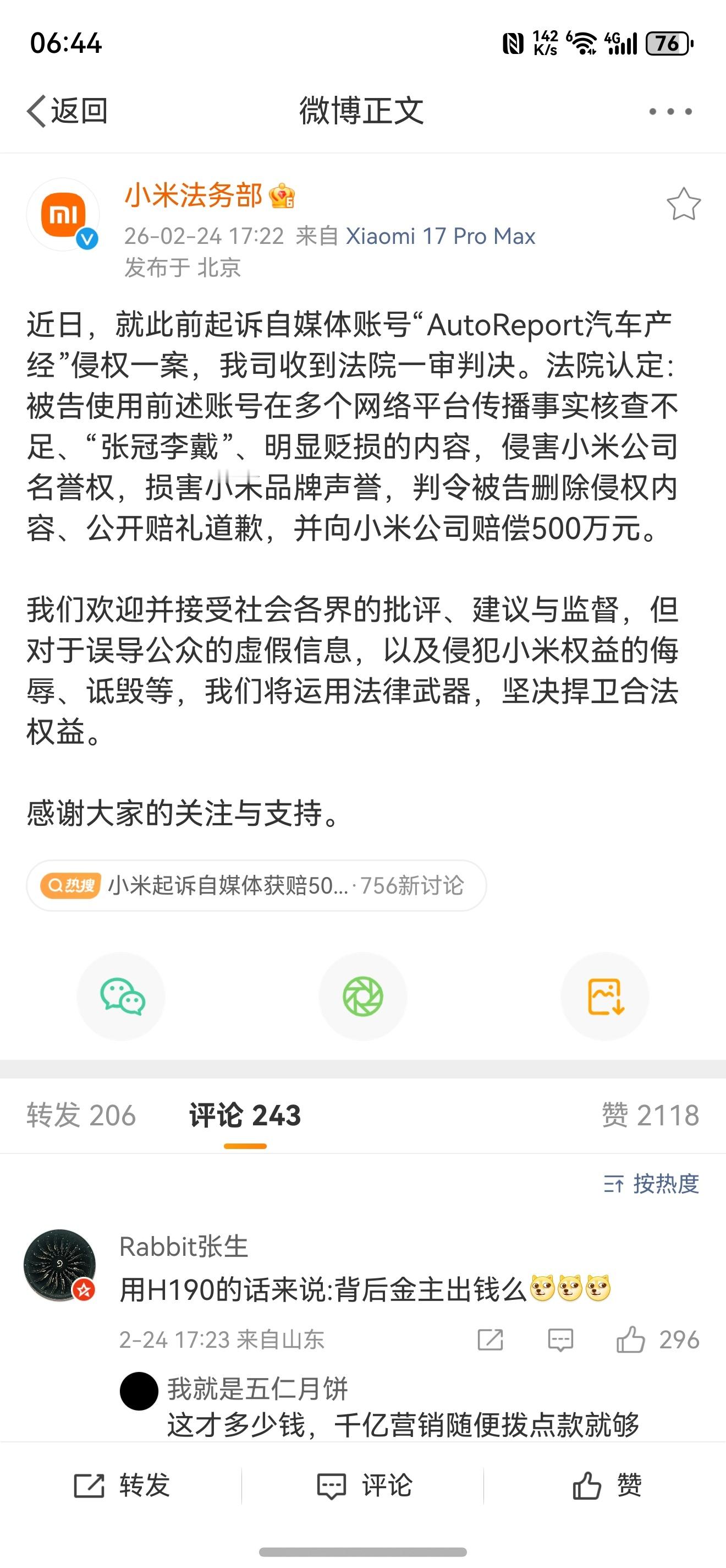 小米起诉自媒体获赔500万开年就爆大消息小米那个500万判例,真是给网络黑手狠狠上了一课。刚被《焦点访谈》点名的“网络黑公关”,转头就遇上硬茬。小米这次赢了,直接让抹黑的自媒体赔了500万!这不只是法务秀肌肉,更是给整个行业敲了警钟。对象是易车旗下的账号,赔款金额达到惩罚级别。国家层面刚发声,司法刀子就跟上,配合得挺好。这下造谣抹黑的代价可再也不是隔靴搔痒了!感觉小米这不只是维护自己,也是在给所有认真干实事的公司撑腰。以前维权多难啊,现在判决这么刚,能看出法治环境在变好。让好好做事的企业得到保护,让搞事情的出局,这才是真正的好环境。这记开年重拳,干得确实漂亮,必须点个赞