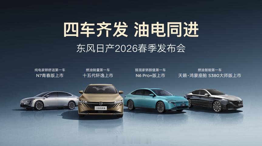 东风日产开年王炸四连发2026马年开年,东风日产一口气狂发四款车,真的是开年红啊!2月24日,“四车齐发,油电同进”东风日产2026春季发布会盛大举行,十五代轩逸、天籁·鸿蒙座舱S380大师版、N6 180 Pro+版、N7青春版等四款新车正式上市。其中,十五代轩逸推出3款车型,上市限时价9.49万元—10.99万元;天籁·鸿蒙座舱S380大师版上市限时价16.19万元;N6 180 Pro+搭载宁德时代电池和Momenta高阶智驾,上市限时价11.19万元;N7全系焕新青春版,上市限时价10.99万元—13.99万元。顺时而为,创势领行。东风日产“家轿第一天团”四车齐发,以“严选产品+严选服务+诚意价格”的核心优势积极回应用户需求。未来,东风日产将以1700多万用户基盘为锚点,坚守卓越品质,坚定“油电同进”,坚定“合资品质严选”,携手千万家庭共赴更加美好的“人·车·生活”。