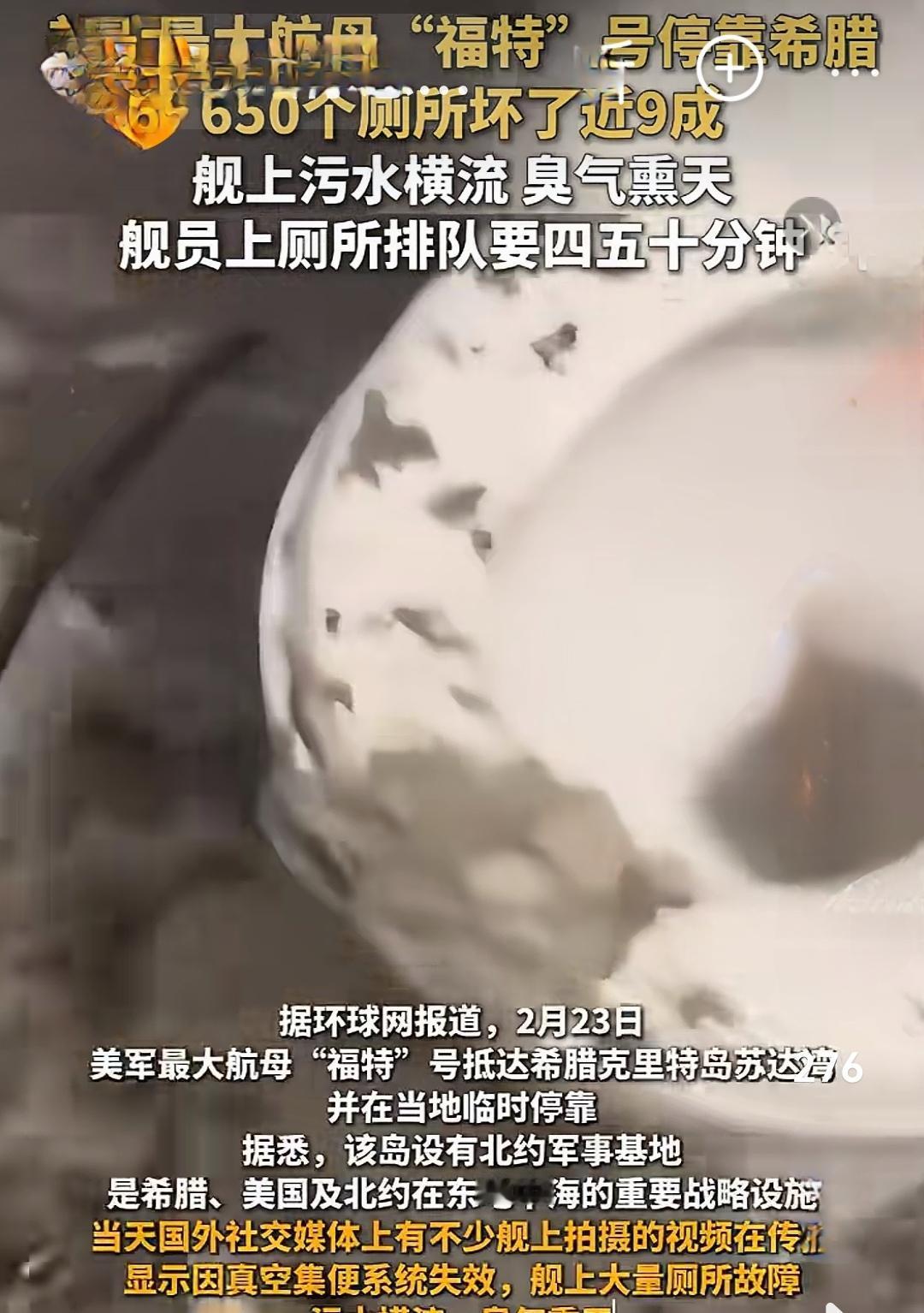 美国“福特”号航母从波斯湾撤了!这状况还想着去波斯湾打伊朗?简直开国际玩笑。2月23日它停靠希腊克里特岛,社交媒体上舰上视频显示,因真空集便系统失效,650个厕所坏了近9成,污水横流、臭气熏天。近5000名舰员上个厕所得排队四五十分钟,据说部分原因是有人往厕所倒垃圾,而且航母移动时还没法维护厕所。 之前美军在中东大规模兵力集结,“福特”号进入地中海想和“林肯”号夹击。可就这连厕所问题都解决不了的航母,战斗力能有多强?去打伊朗,先把厕所修好吧!这也是世界一流吧! 林肯号航母 伊朗航母 美军航母 美海军航母 福特航母
