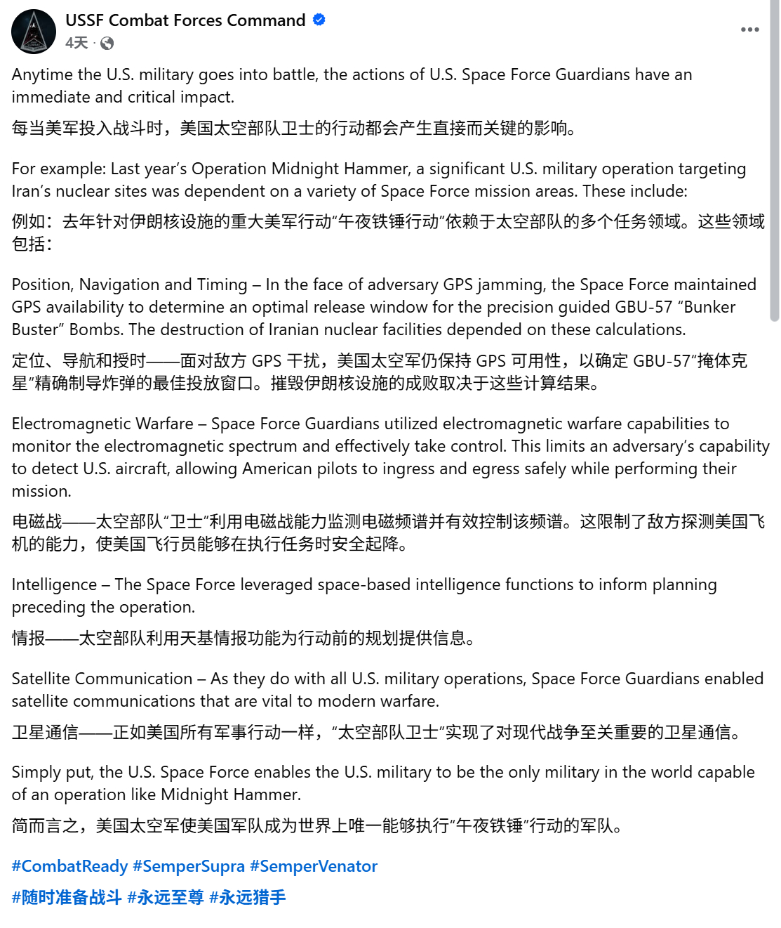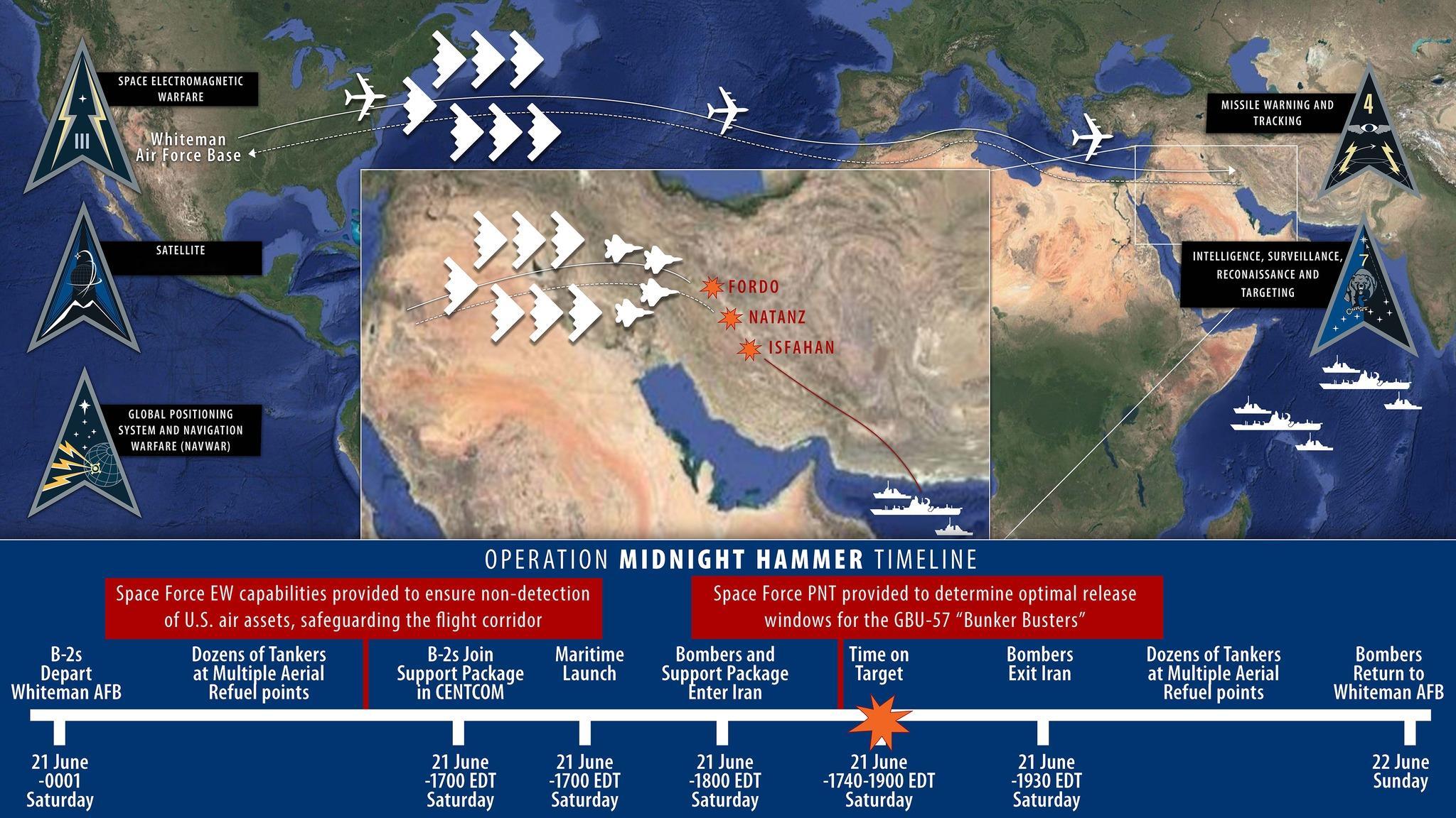 MD人上人(美国太空军)介绍了他们在去年打击伊朗核设施的“午夜重锤行动”的作用,包括:每天认识一件兵器烽火问鼎计划