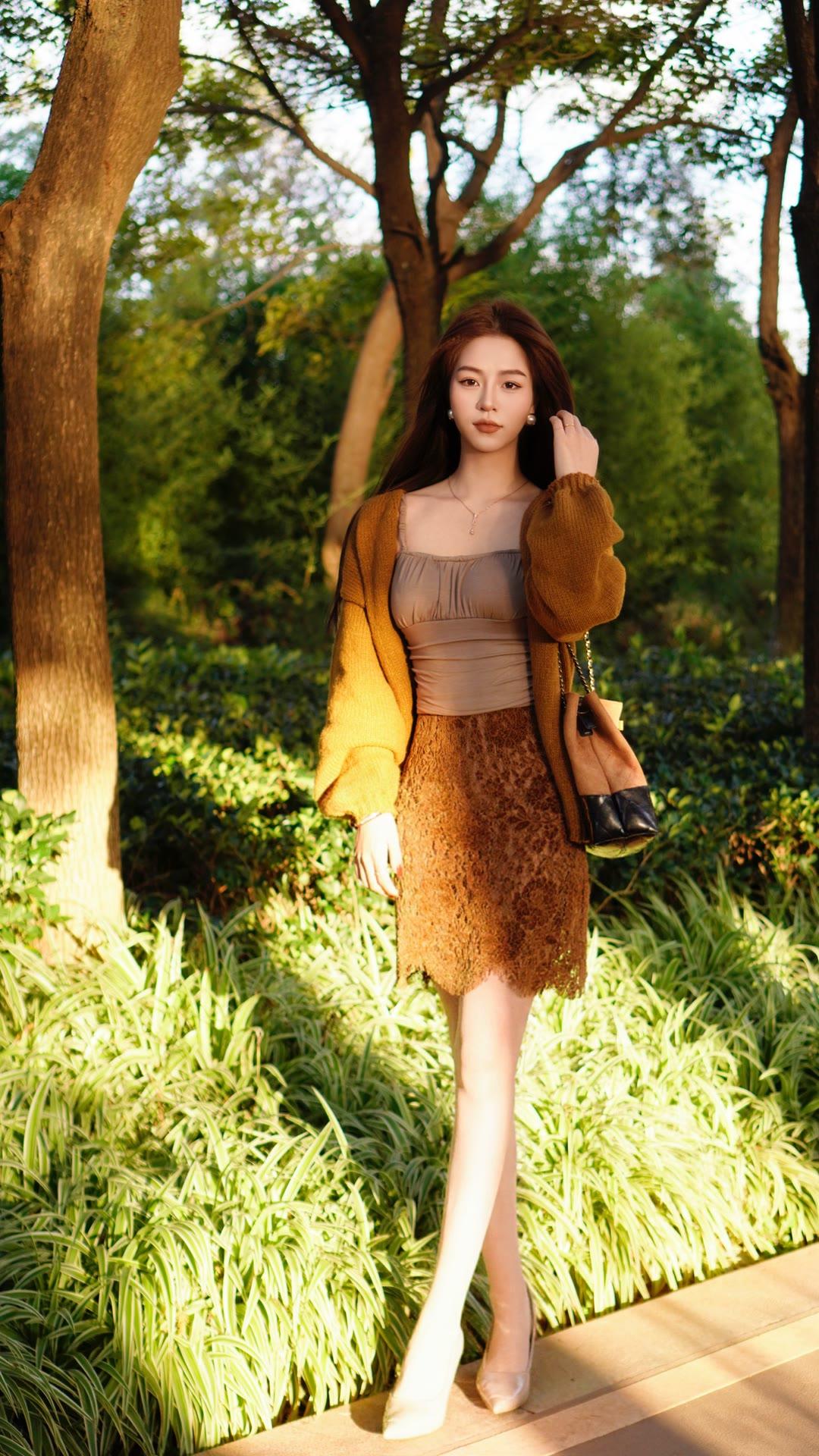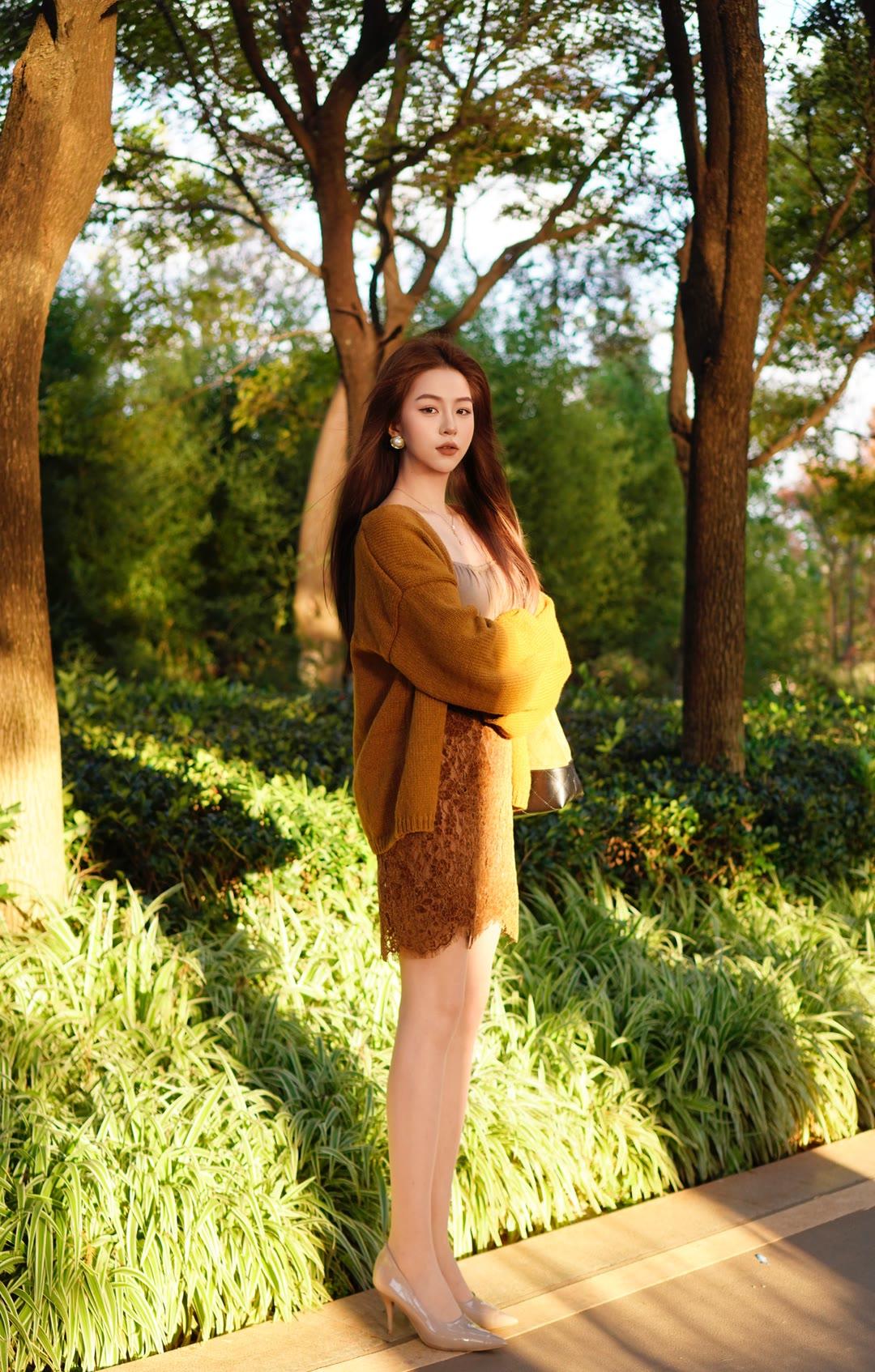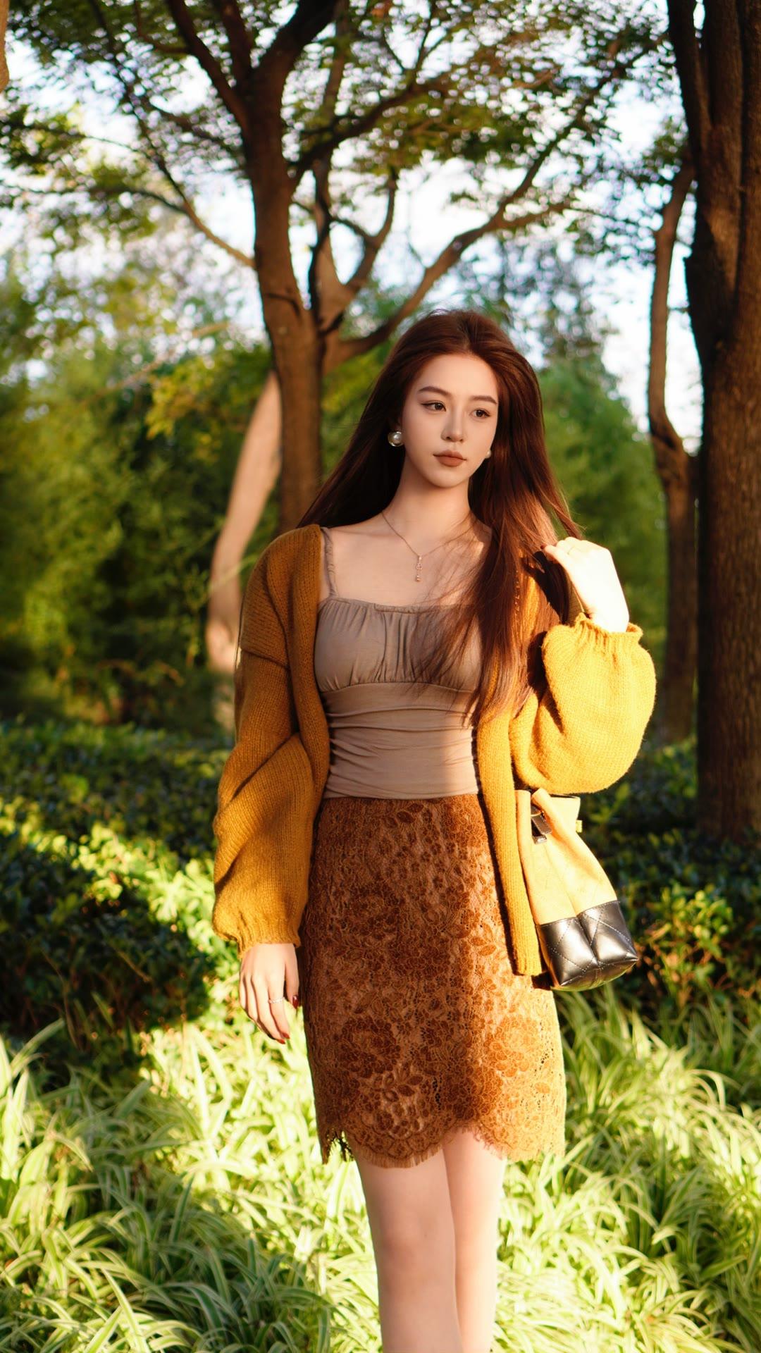 一件柔软的姜黄色针织开衫搭蕾丝半身裙,温柔中透着明亮的色彩,优雅又显气质。