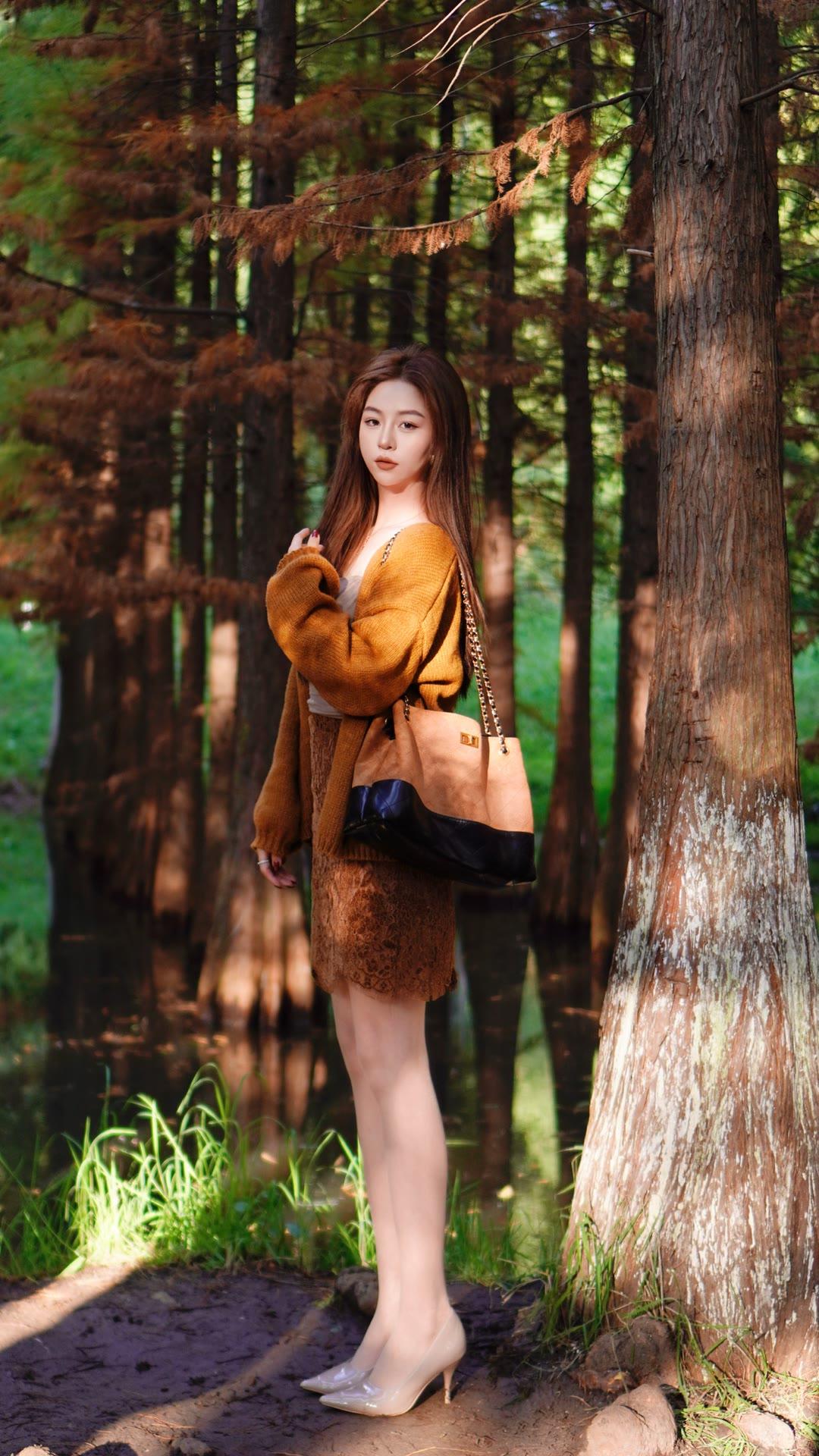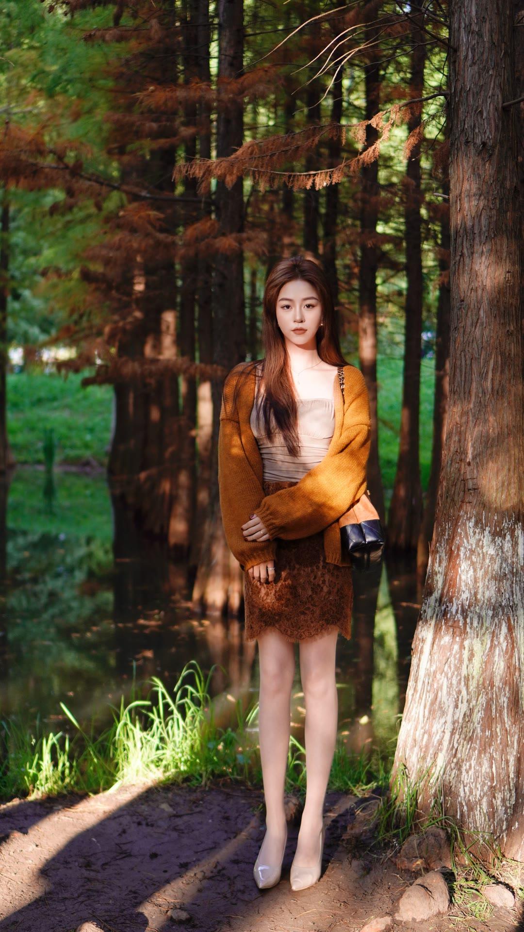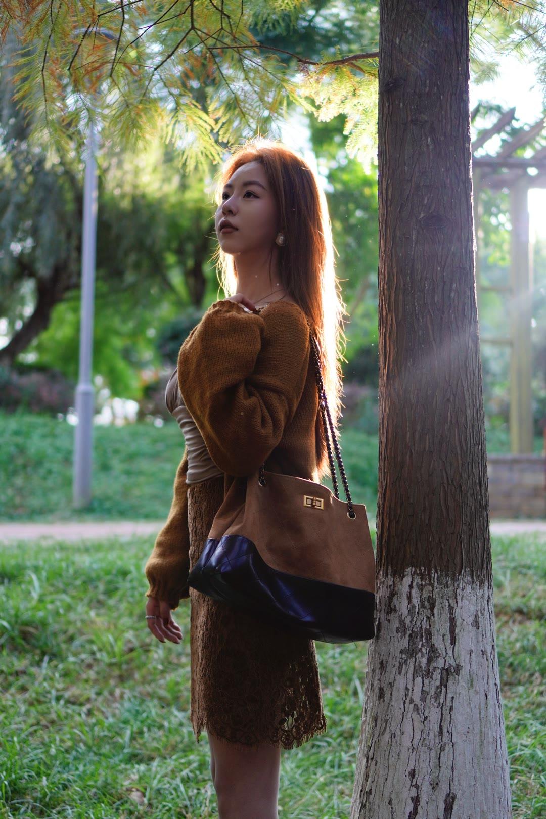一件柔软的姜黄色针织开衫搭蕾丝半身裙,温柔中透着明亮的色彩,优雅又显气质。