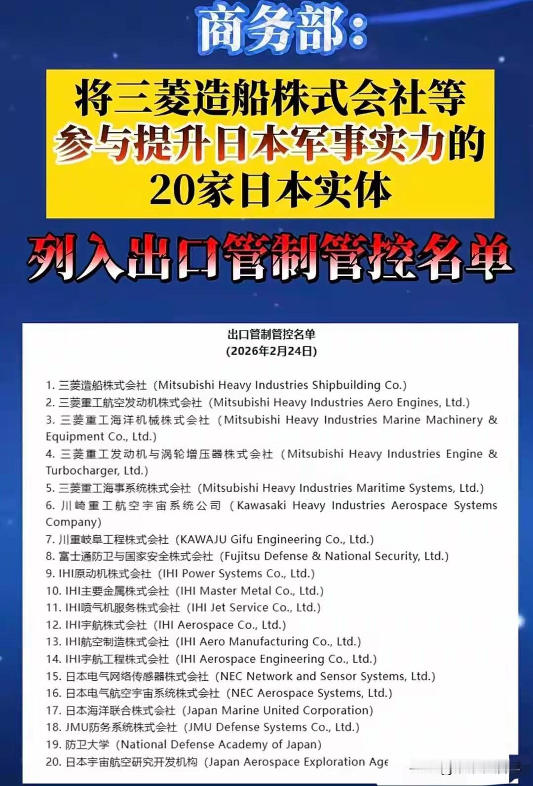 日本在没有任何防备的情况之下,我们对她们启动了新一轮的制裁,这一次给日本来了一个措手不及! 商务部这一手,确实让日本有点懵。名单上包括三菱造船株式会社等二十家实体,都是参与提升日本军事实力的关键企业。 中国明确禁止向这些实体出口两用物项,等于直接掐断了部分关键物资的供应渠道。 日本方面恐怕没想到,中国的反制会来得如此迅速且精准。那么,中国为何选在这个时间点对日本军工“亮剑”? 原因其实很清晰。 近期日本在涉台问题上的挑衅不断加码,不仅政客频频抛出“台湾有事就是日本有事”的荒谬言论,防卫省还公然计划在与那国岛部署导弹部队,距离台湾仅110公里。 这种步步紧逼的军事动向,已经严重威胁到地区和平稳定。 中国的反制,不是无缘无故的。你一边嘴上说着要推进“战略互惠关系”,另一边却偷偷磨刀霍霍,甚至把刀尖抵近中国核心利益区。天下哪有这样的道理? 这次出口管制,就是明确告诉日方:玩火者,必自灼。中国有足够的工具和决心,维护自身主权和安全。 从战略角度看,这次制裁也打在了日本军工的“七寸”上。 许多日本防务企业的供应链,依然依赖来自中国的关键原材料和零部件。一旦断供,其新型舰艇、导弹等项目的研发和生产进度,难免受到影响。 这不仅是经济层面的反制,更是对日本冒险军事倾向的一种警示。 当然,中国的目的并非要彻底切断与日本的经济联系,而是划出清晰的红线:台湾问题是中国内政,不容任何外部势力干涉。 日本若执意跟随某些大国搞阵营对抗,甚至企图军事介入台海,必将付出相应代价。 这场博弈,看似突然,实则必然。日本部分政客若仍沉浸在“脱钩断链”的幻想中,继续在危险边缘试探,那么类似的“措手不及”,未来可能还会更多。 中国维护国家统一的意志坚如磐石,任何挑战这一底线的行为,都不会有好果子吃。日方是时候冷静下来,重新掂量掂量了。
