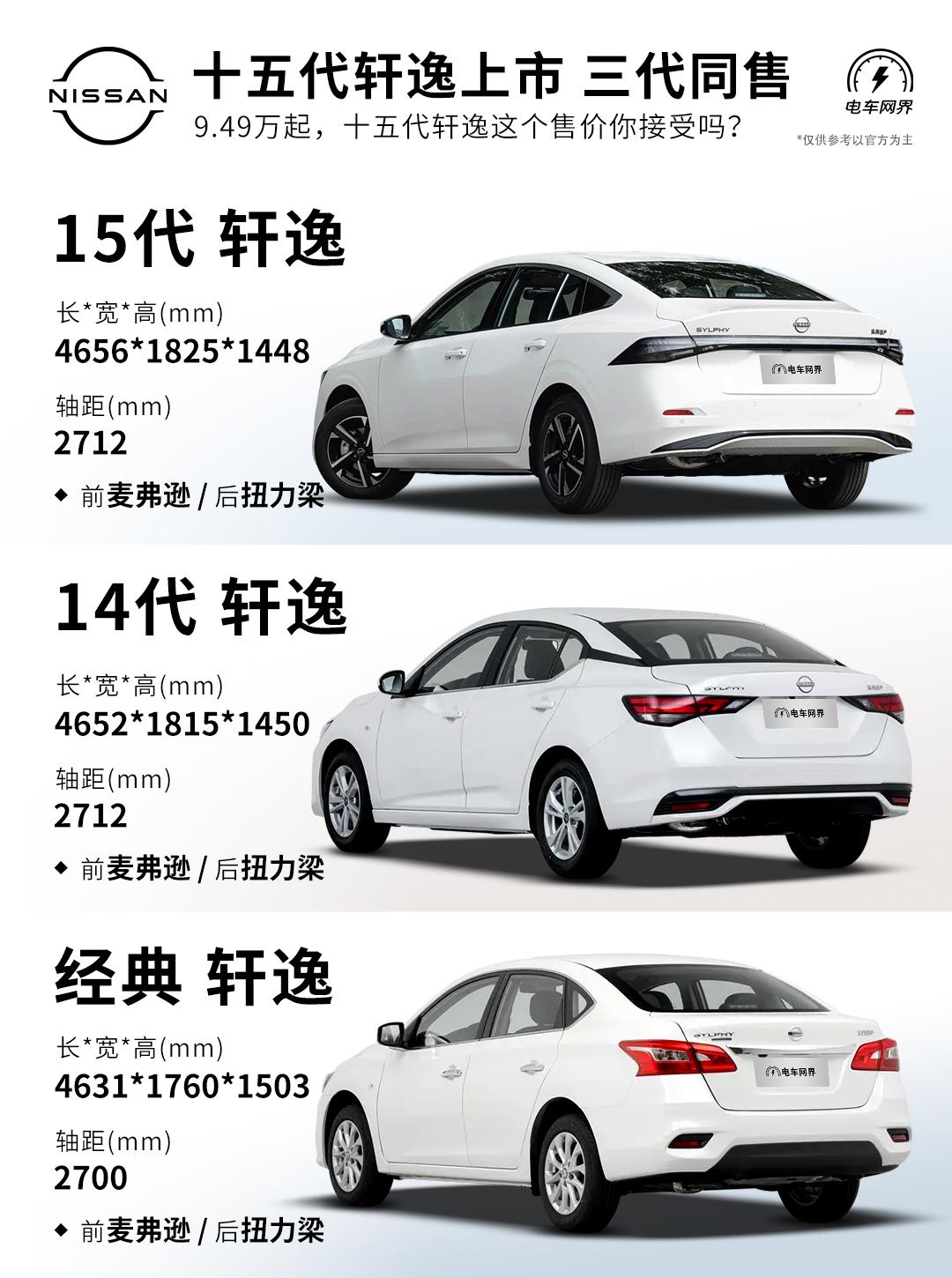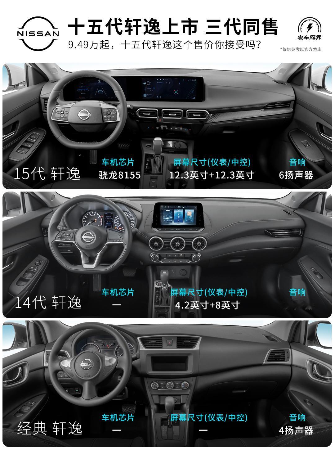 全新一代(15代)轩逸上市,限时9.49万-10.99万元,全新的外观内饰设计,但动力系统以及底盘没有什么变化。 外观方面改动比较大,个人觉得还是14代更好看,内饰采用双辐式方向盘,全系标配双联屏+骁龙8155芯片组合。 新款上市后,轩逸家族将呈现三代同堂销售的策略,涵盖了6-10万的价格区间,面对大众朗逸、丰田拉罗拉等对手,你觉得全新轩逸这个价格有竞争力吗?【来自懂车帝车友圈】
