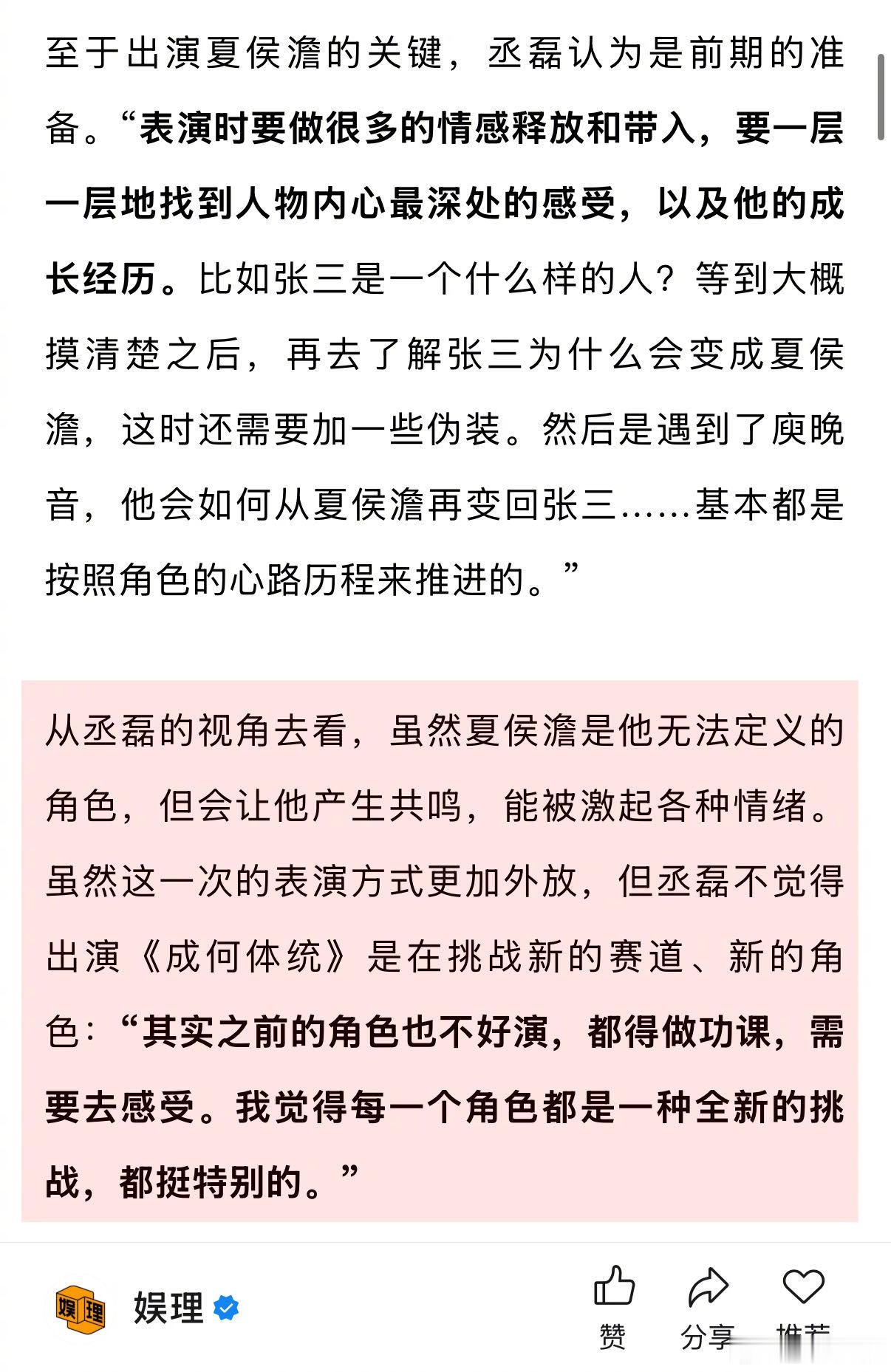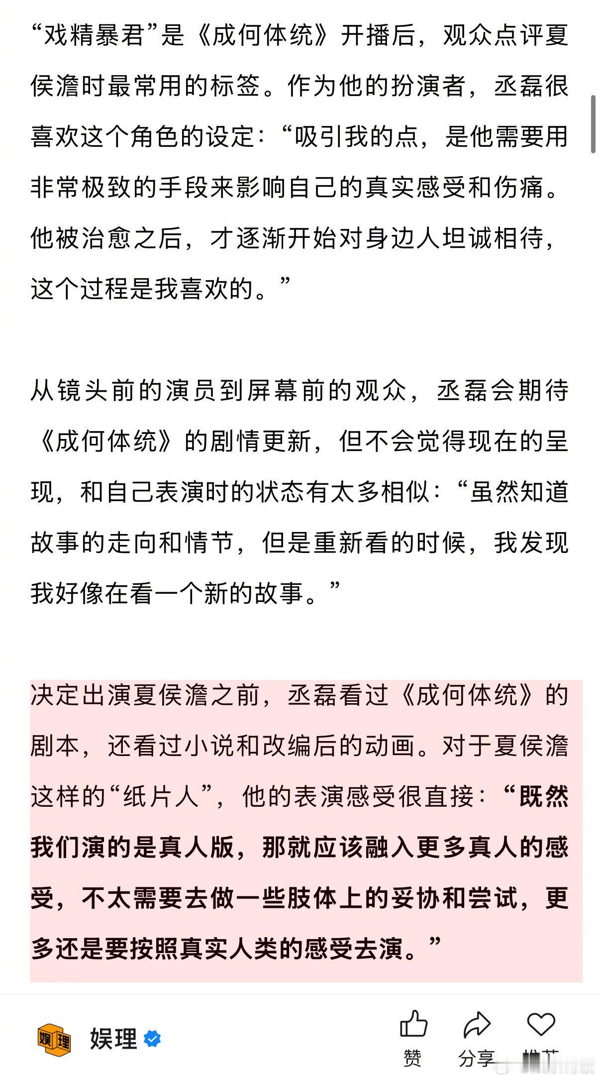 丞磊说自己和王楚然挺同频的丞磊回应观众追剧爱嗑CP 决定出演夏侯澹之前,看过《成何体统》的剧本,还看过小说和改编后的动画。对于这样的“纸片人”,他的表演感受很直接:“既然我们演的是真人版,那就应该融入更多真人的感受,不太需要去做一些肢体上的妥协和尝试,更多还是要按照真实人类的感受去演。”娱理独家↓
