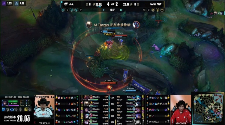 [18:22]AL中路推进,Tarzan潘森落地再杀About芸阿娜,AL推掉WE下路二塔,Tarzan坐先锋撞掉WE中路二塔,经济领先8.4k。
