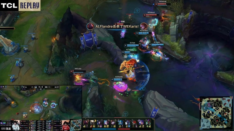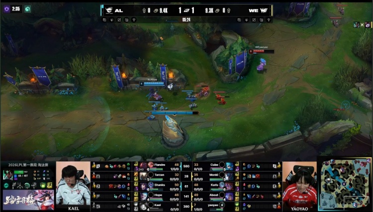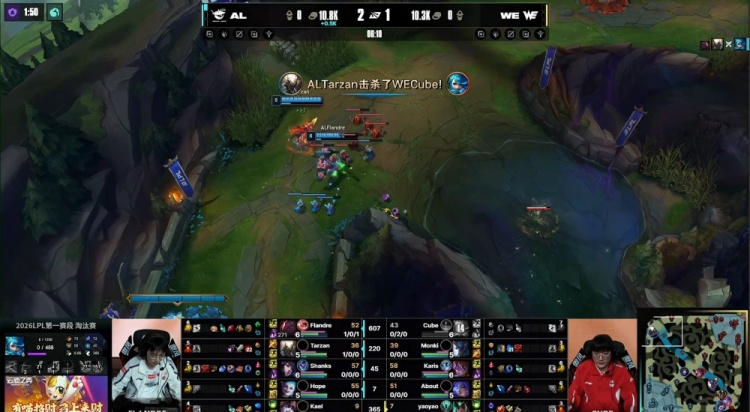 [15:27]AL中路推进,WE野辅瞬间被杀,AL打出0换2推掉WE一塔,经济领先4.5k。