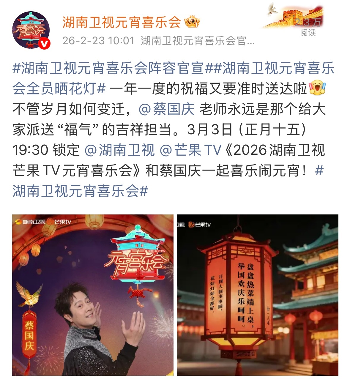 蔡国庆一首歌唱到退休 一首歌唱到退休,是情怀也是底气!蔡国庆用《365个祝福》陪伴无数个团圆时刻,这首歌更是元宵晚会的经典名场面。官宣加盟湖南卫视元宵喜乐会,熟悉的祝福即将上线,坐等重温刻进DNA的温暖旋律。