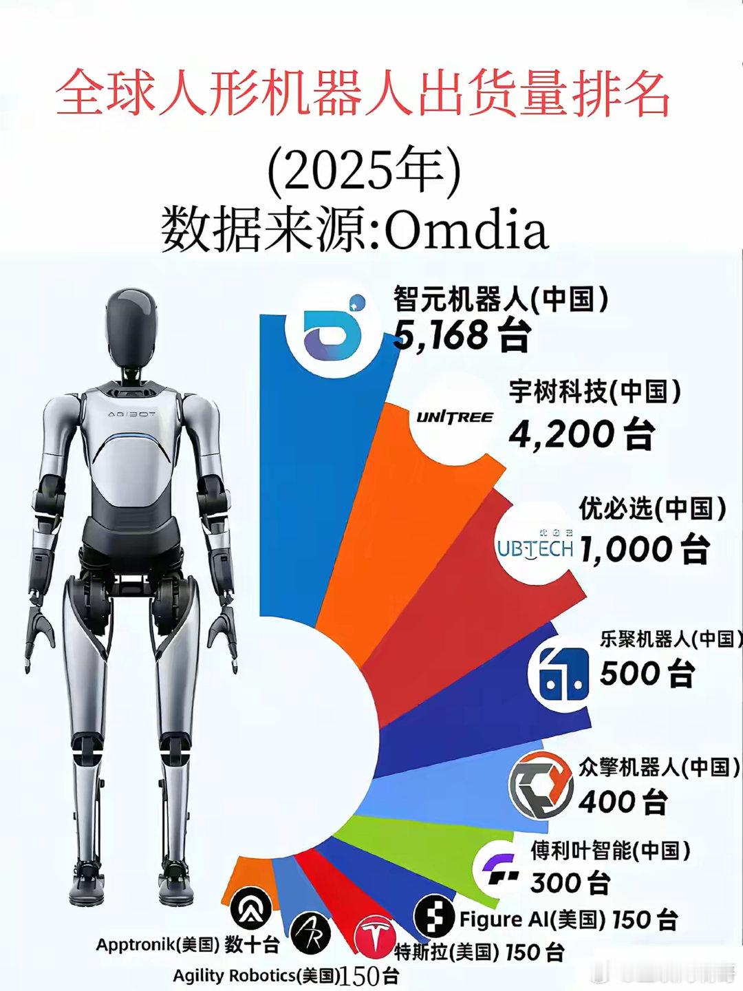 全球人形机器人出货量排名。位列第一的居然不是“宇树科技”的机器人。不过,虽然宇树科技位列第二,但是出货量位列第一,第三,甚至第四、第五、第六都是来自中国的机器人企业。这就是实力的体现了。当然,人形机器人起步不久,随着科技的日新月异,相信人形机器人出货量会更多。