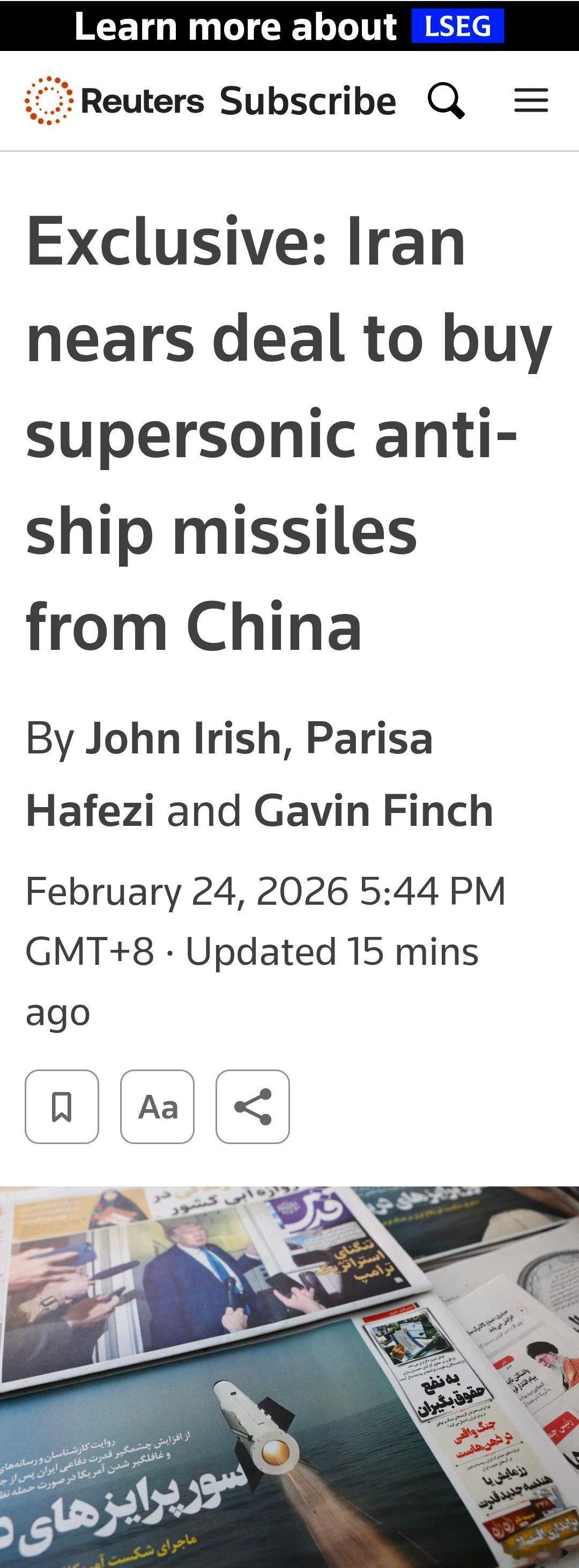 路透社独家报道说,他们采访了了解情况的6个人。伊朗已经极为接近从中国购买超音速C302岸舰导弹。该导弹射程290公里,伊朗安全官员透露,去年夏天谈判进入最后阶段时,伊朗军方和政府高级官员访问了中国,其中包括伊朗国防部副部长马苏德·奥雷伊(Massoud Oraei)。“如果伊朗拥有超音速攻击该地区船只的能力,那将彻底改变游戏规则,”前以色列情报官员丹尼·西特里诺维奇(DannyCitrinowicz)说。他现在是以色列国家安全研究研究所(InstituteforNationalSecurityStudies)的伊朗高级研究员。"这些导弹很难拦截."不过中国没有证实这一消息。