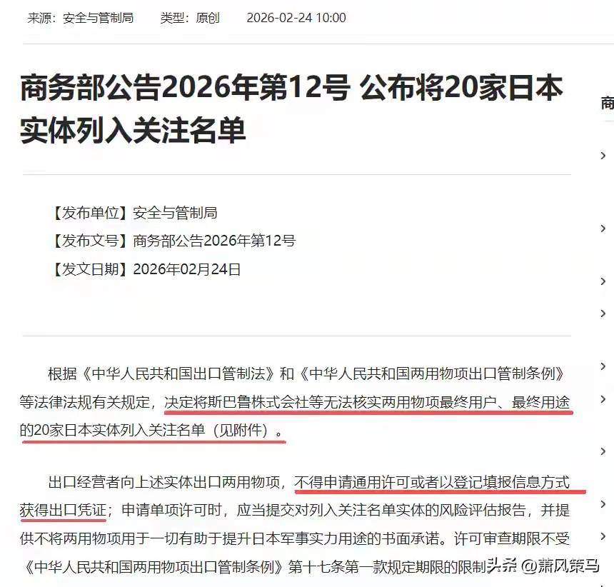 中方精准出手,把20家日本涉军实体纳入出口管制,一刀戳中要害。高市政府当场破防,跳脚强烈抗议,姿态拉满却毫无办法。自己先在涉华、涉台问题上玩火,触碰红线,就别怨中方依法反制。抗议喊得再响,挡不住规则落地;嘴上不服软,身子很诚实。这就是底线不容试探,惹了就要付出代价,没什么可商量的。