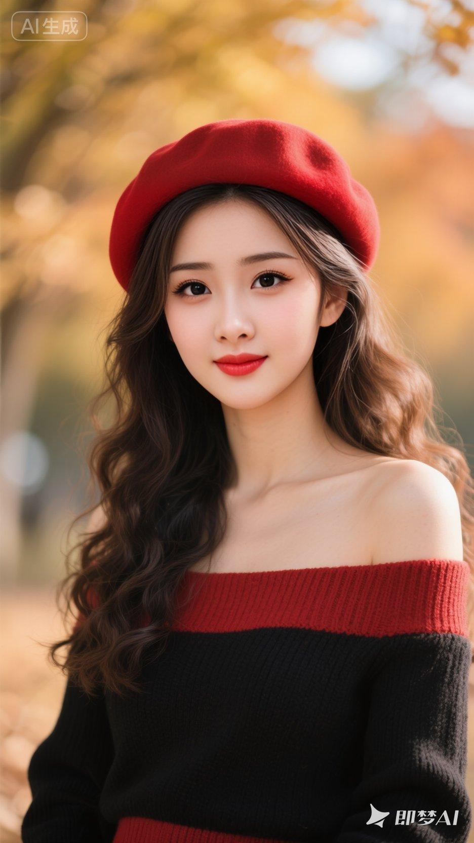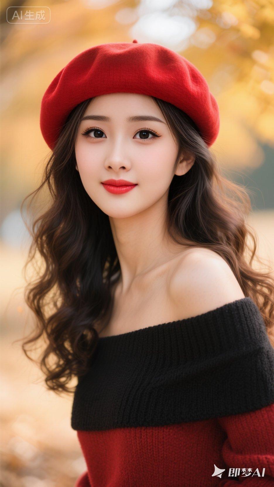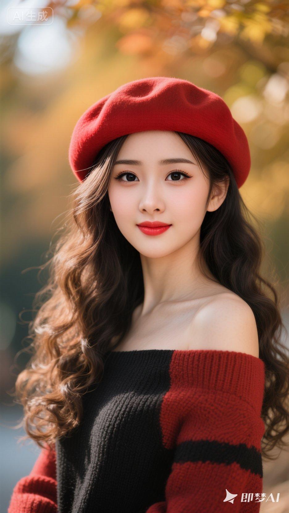 漂亮女孩,动作随机,戴着色的贝雷帽,穿着红黑色露肩毛衣,长波浪卷发