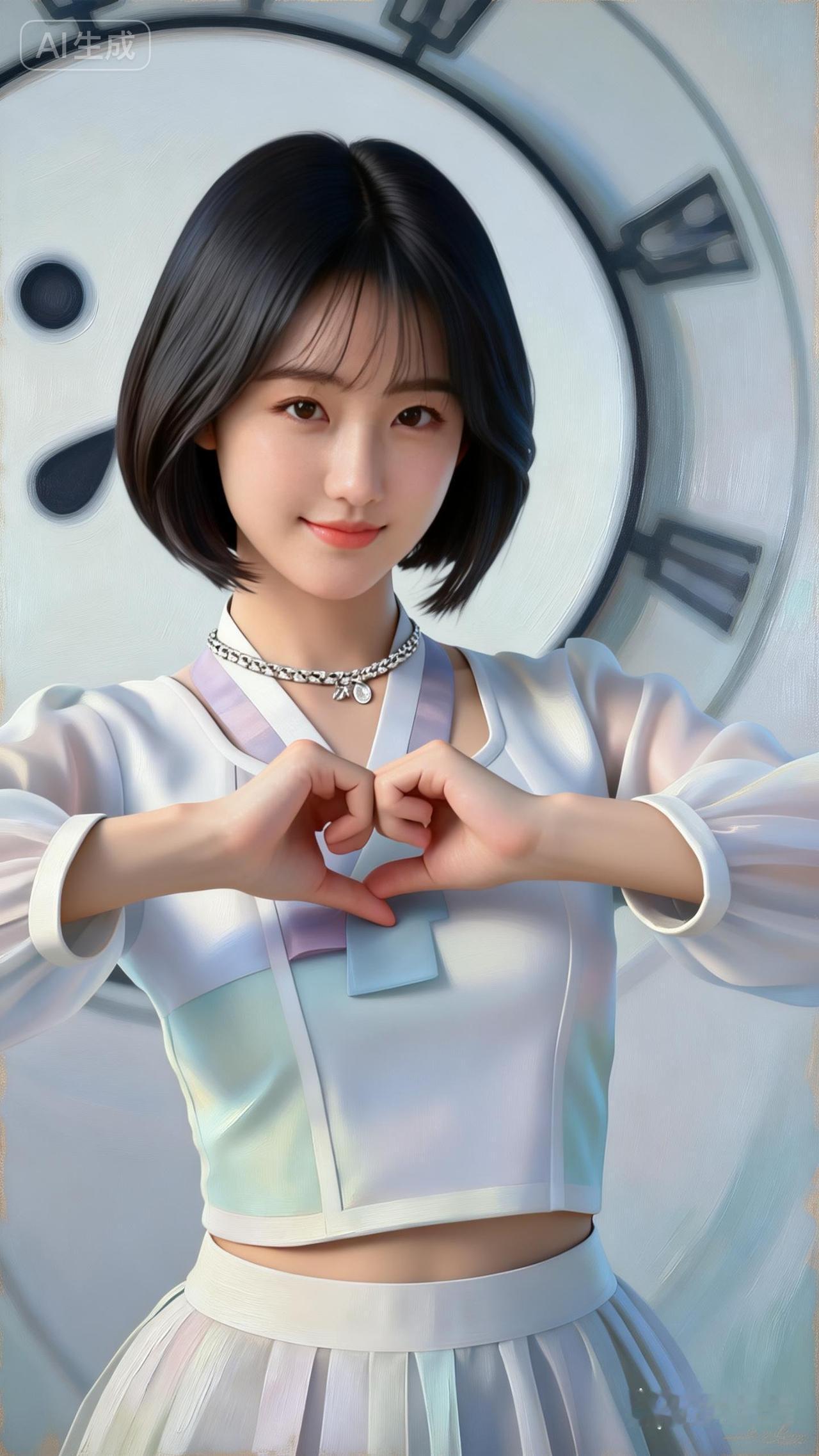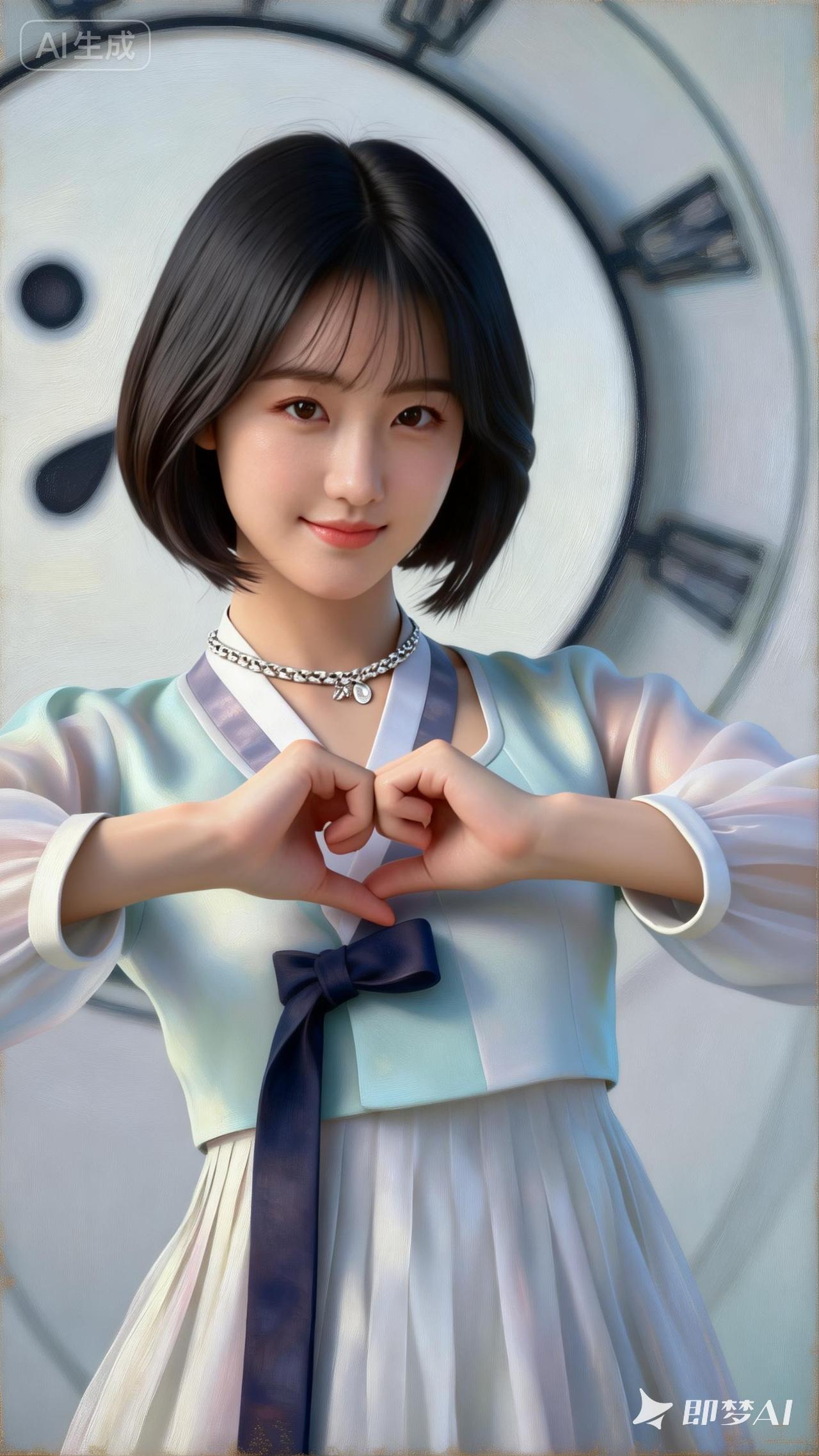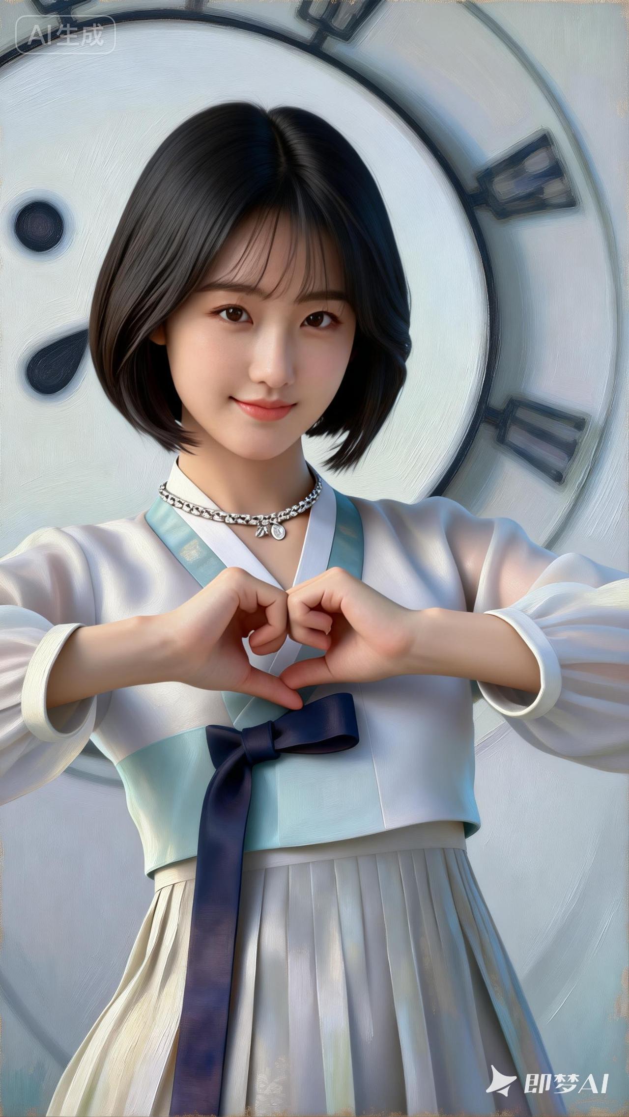 精致的五官,温柔浅笑,韩服风俗娘,美人金泰希半身肖像油画,皮肤细腻光滑,妆容淡雅