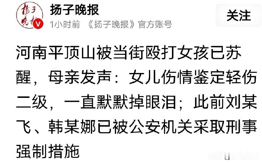 鉴定结果出来了,这次两名施暴者嚣张到头了 河南被打女孩一案牵动着全网民众,昨天女孩的伤残鉴定被公布,属于轻伤二级伤残等级,女孩母亲解决不和解。如果坚决走法律程序来讨一个说法,两名施暴者牢狱之灾是避免不了的了,如果真如网友爆料属实的话,两个人都有前科犯罪记录的,就不是赔偿跟拘留这么简单了,最少也要判个几年了,都说家有一老,如有一宝,这家的宝是一个惹祸的祸害呀,就因一次剐蹭,一个电话一个完整的家散了不说,有可能影响了子孙后代了,真是得不偿失啊图片来源齐鲁晚报,扬子晚报,侵权速删