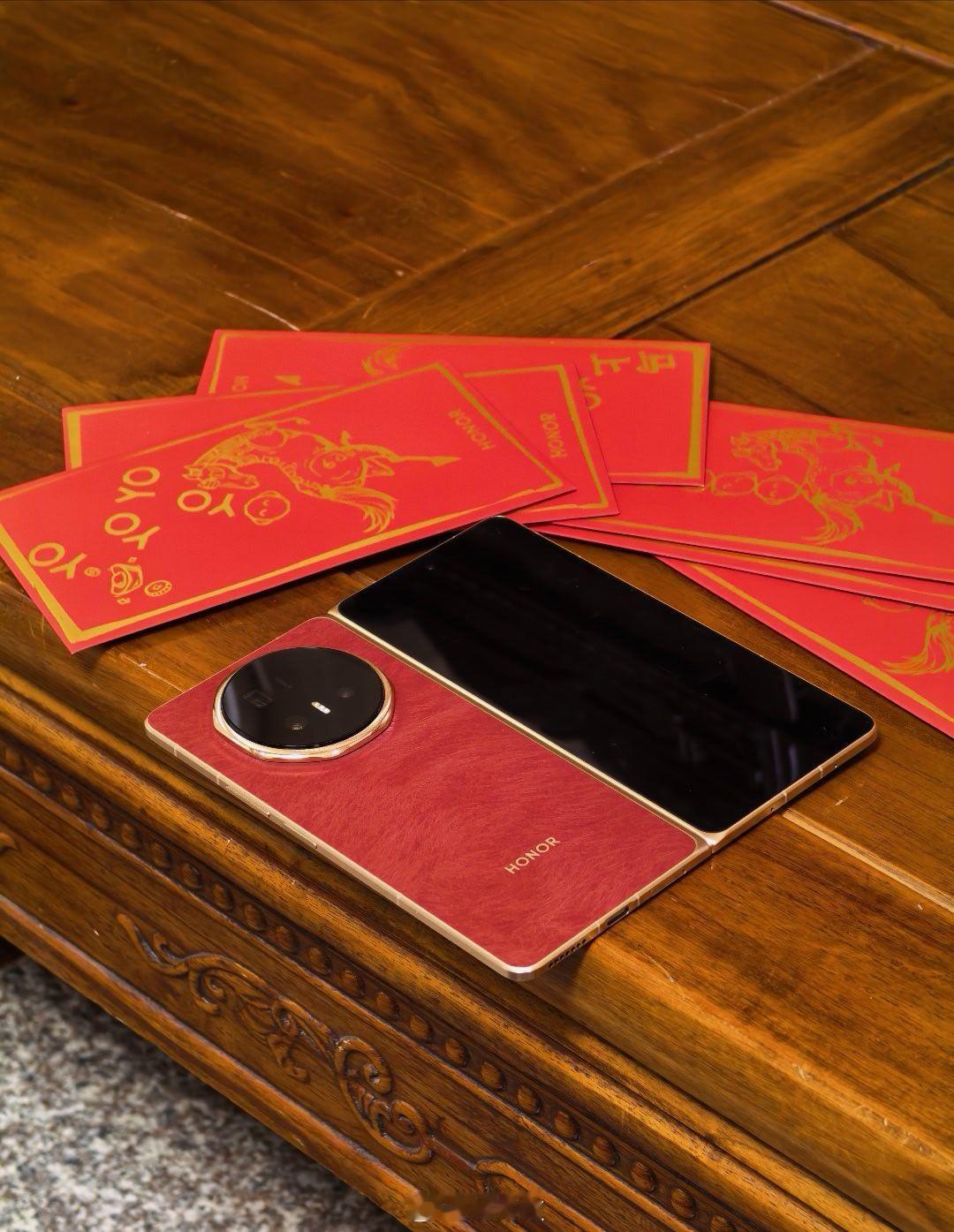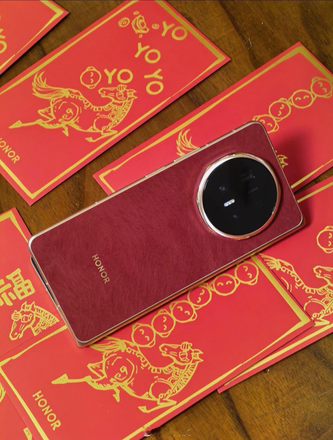荣耀Magic V6赤兔红真的把红色做高级了!比上一代更轻薄,展开手感更舒服。绒马环保皮自带马毛纹理,摸起来温润细腻,红得有层次、不俗艳。穹顶八边形镜头设计精致耐看,防水耐刮又实用。把故宫朱漆、东方美学揉进折叠屏,颜值与质感双双在线,更多惊喜一起期待!荣耀MagicV6 屏实力马上红