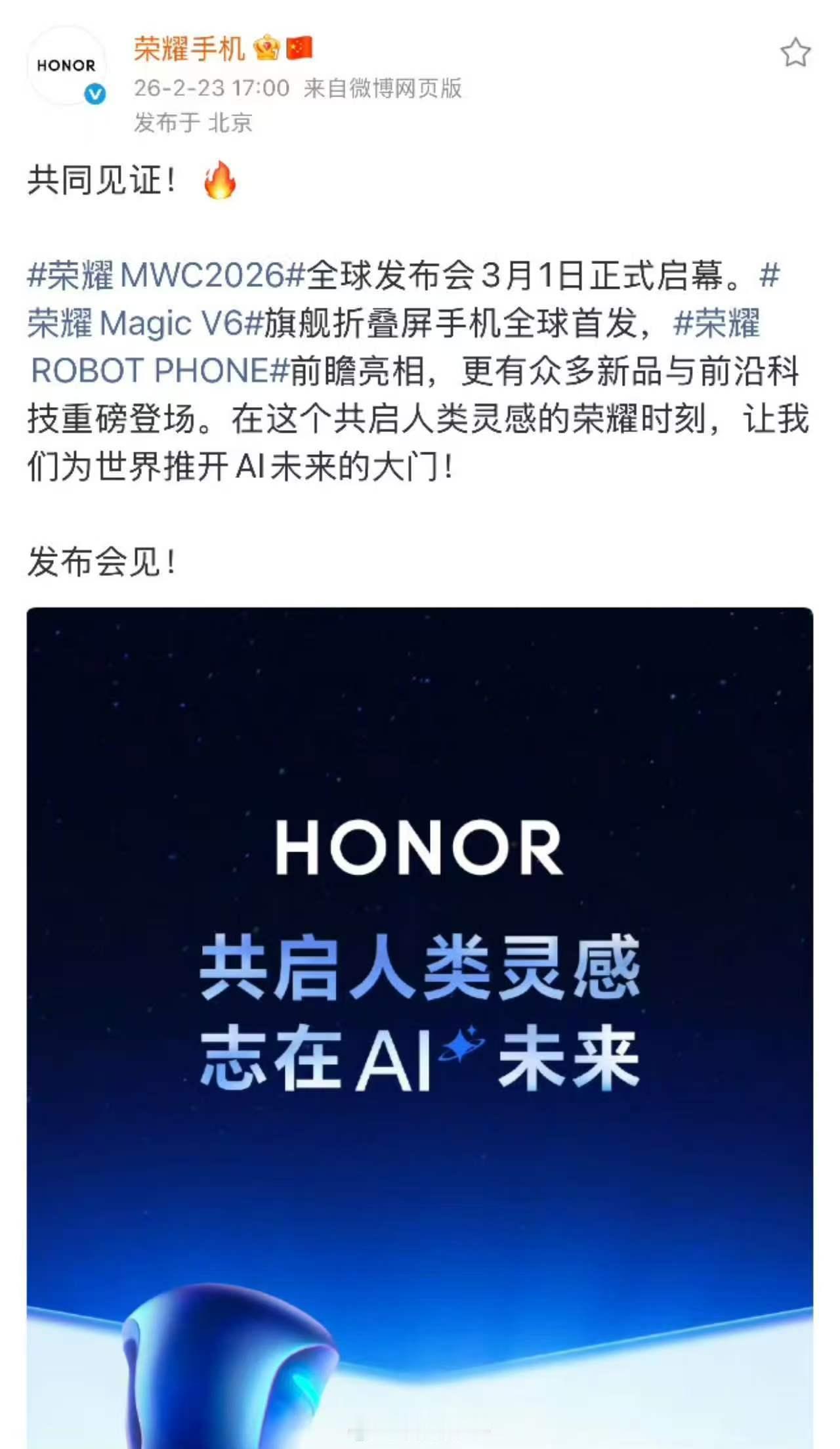 荣耀官宣3月1日MWC首发消费级人形机器人,还顺带解锁了“机器人手机”新形态。作为全球首家跨界布局的手机厂商,这步棋直接把赛道拓宽了。比起“人形”的噱头,我更关心两个核心:一是手机与机器人的互联生态,二是消费级产品的实际落地体验。如果能解决续航和轻量化,这可能真会是继折叠屏后的下一个行业拐点。蹲一个真机上手,看看这次是“遥遥领先”还是“概念先行”?荣耀将推出首款人形机器人