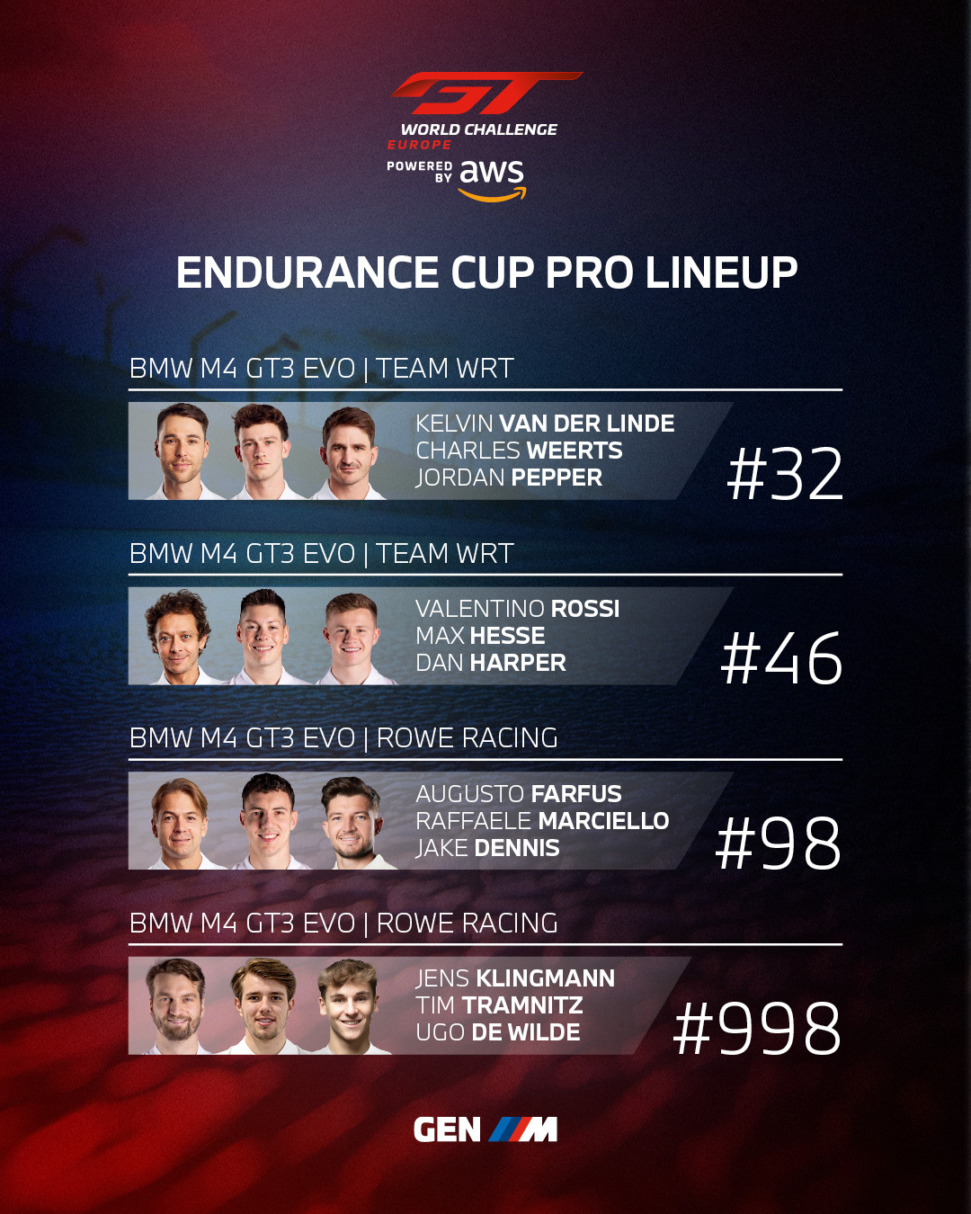 WRT会运营三台宝马M4 GT3 EVO参与冲刺杯的竞争,在耐力杯则是派出两台赛车;而ROWE Racing则继续专注耐力杯,派出两台赛车参赛,其中98号车跑Pro组,998号车进入金组,而在车手部分比利时小将科迪尔就将随WRT参加冲刺杯。