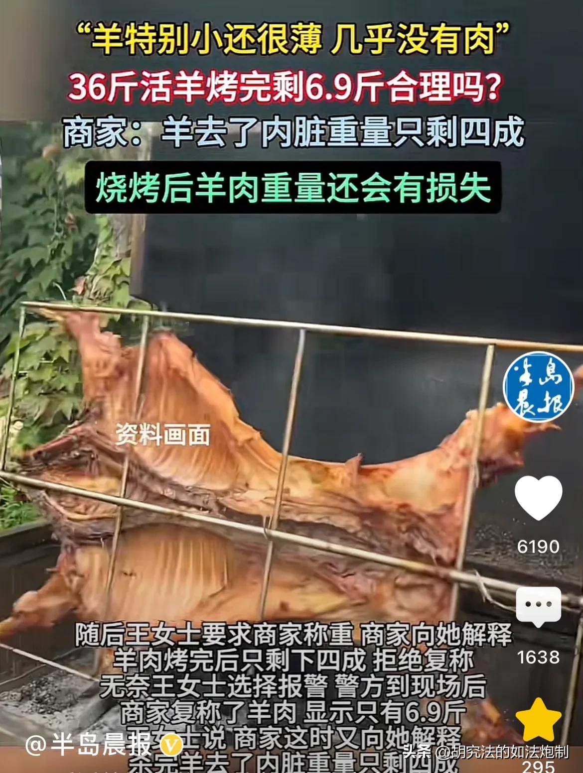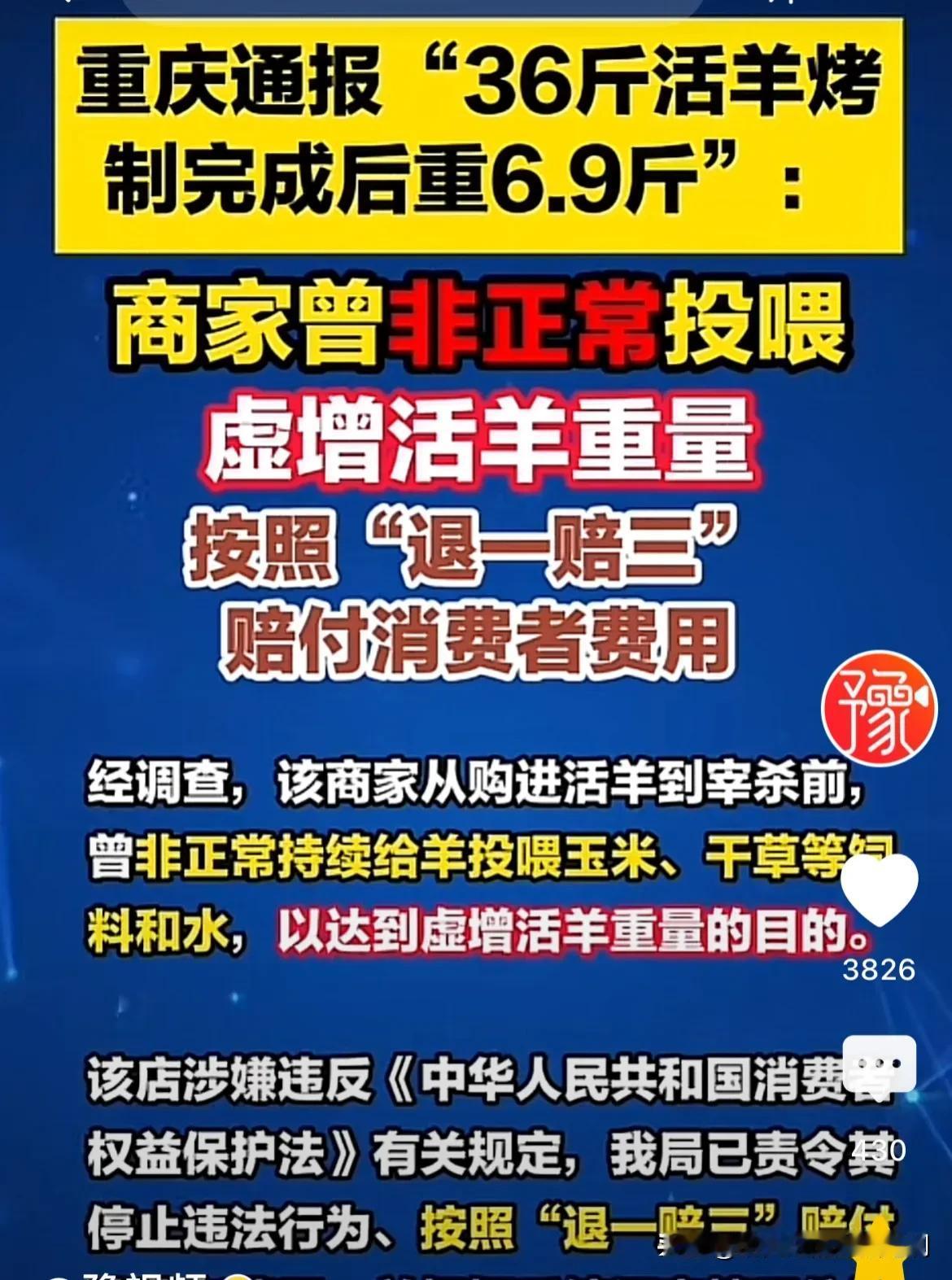 “简直是被猪油蒙了眼!”重庆,一女子花1188元带全家吃烤全羊,可吃饭时女子发现,称重36斤的活羊,烤完又小又薄,几乎没有几两肉。女子要求商家重新称重,可商家不同意,还说羊肉烤完了就这样,能剩下4成就不错了。等民警来到后商家复称,显示羊肉只有6.9斤。商家解释说,去掉内脏就剩4成,烤完还会有损失。女子无法接受,可她又不懂,只能发视频寻求帮助。有关部门回应了! 从年头忙到了年尾,辛苦工作了一整年,王女士准备好好的犒劳一下自己以及家人,于是便从一家饭店里订了一个烤全羊。 烤全羊的价格可不便宜,再加上又是春节期间,即便价格有明显的上涨,店里的生意依旧非常火爆。 王女士来到店里,立即有店员热情招待了王女士,告诉王女士他们店都是活羊现杀,杀之前还会进行称重。 在了解完王女士的需求之后,店员向王女士推荐了一个1188元的套餐,王女士在看到套餐的内容之后,便也同意了。 带着一家人来到店里之后,安排好家里人王女士便连忙来到了后厨,经过精心挑选,王女士挑好了一只羊,称重显示为36斤。 王女士盘算了一下,一家人吃这一只羊绝对绰绰有余了。可是再耐心等待一番,等烤全羊上桌之后,王女士以及家人彻底傻眼了。 只见上来的烤全羊,又小又瘦,肉还很薄几乎就没有多少肉,这与王女士看到的活羊完全是两码事。 王女士的家人小心的提醒了一句,是不是店家给上错了? 王女士自己也感到很奇怪,他让家人不要先动筷子,连忙去找到老板,希望老板能够重新进行复称。 没想到这个看似非常合理的要求,却遭到了店家的一口回绝。 不过见王女士有些疑虑,店家还是耐心的解释起来。 烤全羊本来就会有折损,对比活羊能有四成的重量,就已经很不错了。 面对店家的解释,王女士根本就不信。就算按照店家的说法,烤完羊还能剩下4成,那么36斤活羊应该是14斤才对。 可是他面前的这只烤全羊,根本就不可能达到14斤。 大过年的遇上这样的事情,王女士被气的不轻,立即选择了报警。 在民警的协调之下,店家终于同意复称。复称结果显示烤全羊的重量为6.9斤,与理论上的数值相差太远了。 直到这个时候,店家丝毫不慌,说是王女士没有听懂他的意思,所谓的四成是活羊,去掉内脏后只剩下四成,如果再通过烧烤之后,重量自然就不足四成了。 可王女士早就对店家失去了信任,一定要查个水落石石出,可是他又不懂这方面的知识,只能把视频发布在了网络上,没想到却引起了记者的关注。 记者随即向涉事门店了解情况,哪怕到了这一步店家还是固执的表示,店内所有的烤全羊都是经过顾客挑选之后做上标记的,至于为什么在考完之后与活体存在较大的差距是由于活羊之间存在差异。 再加上顾客对于烤全羊的火候要求不一致,重量上自然也会有所差异。 当地有关部门在了解到情况之后立刻对这名店家进行调查,还真发现了猫腻。 原来。该商家从购进活羊,到宰杀之前使用非正常手段持续给羊投喂玉米干草等饲料以达到增加活羊重量的目的。 根据《消费者权益保护法》第55条规定,经营者提供商品或者服务有欺诈行为的,应当按照消费者的要求增加赔偿其受到的损失,增加赔偿的金额为消费者购买商品的价款或者接受服务的费用的三倍;增加赔偿的金额不足五百元的,为五百元。法律另有规定的,依照其规定。 依据上述法律有关部门已经责令该店停止违法行为,按照退一赔三的原则赔偿王女士的费用。 在这里要为重庆当地有关部门的及时处理而点赞,更应该向王女士这种“较真”的消费者点赞! 正是因为有了像王女士这样的消费者,面临消费欺诈的时候能够选择不妥协、不屈服,勇于站出来揭露商家的欺诈行为,才会让整个社会环境变得越来越好。 对此你怎么认为呢?