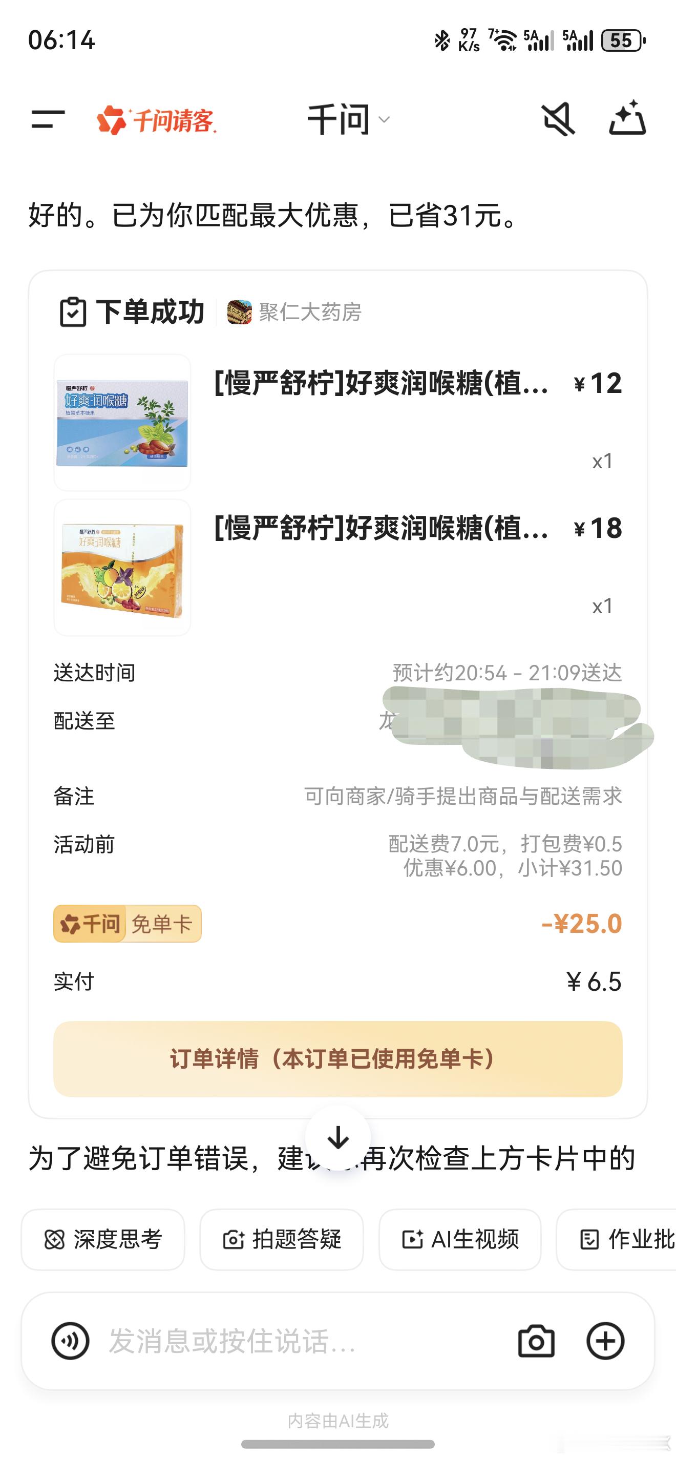 薅了千问15张免单卡,今天还剩1张,春节假期期间用了不少,没办法,忍不住想买买买哈哈。其实千问还挺方便的,一句话不仅仅可以买饮料奶茶,还能买水果买药,假期上火嗓子疼,还买了润喉糖,买什么东西直接说就行了,千问会自动匹配你最近的超市药店,不用自己再打开外卖软件搜索了,还挺方便的!
