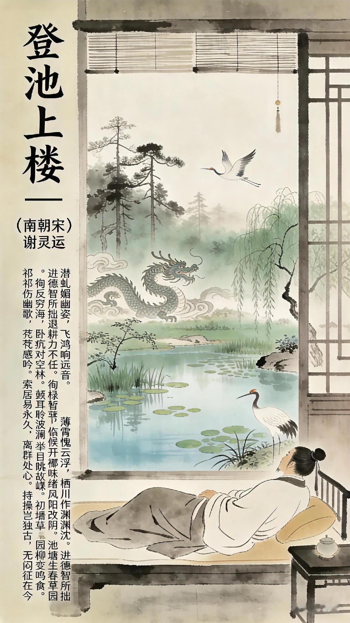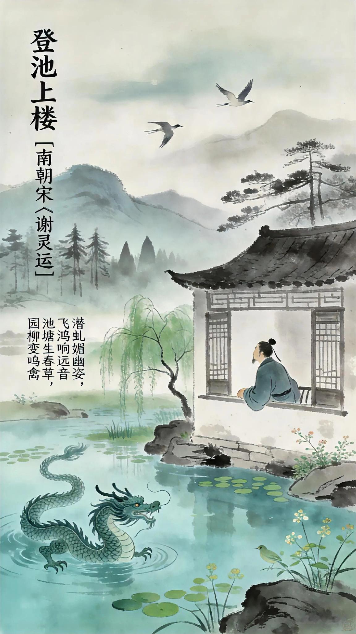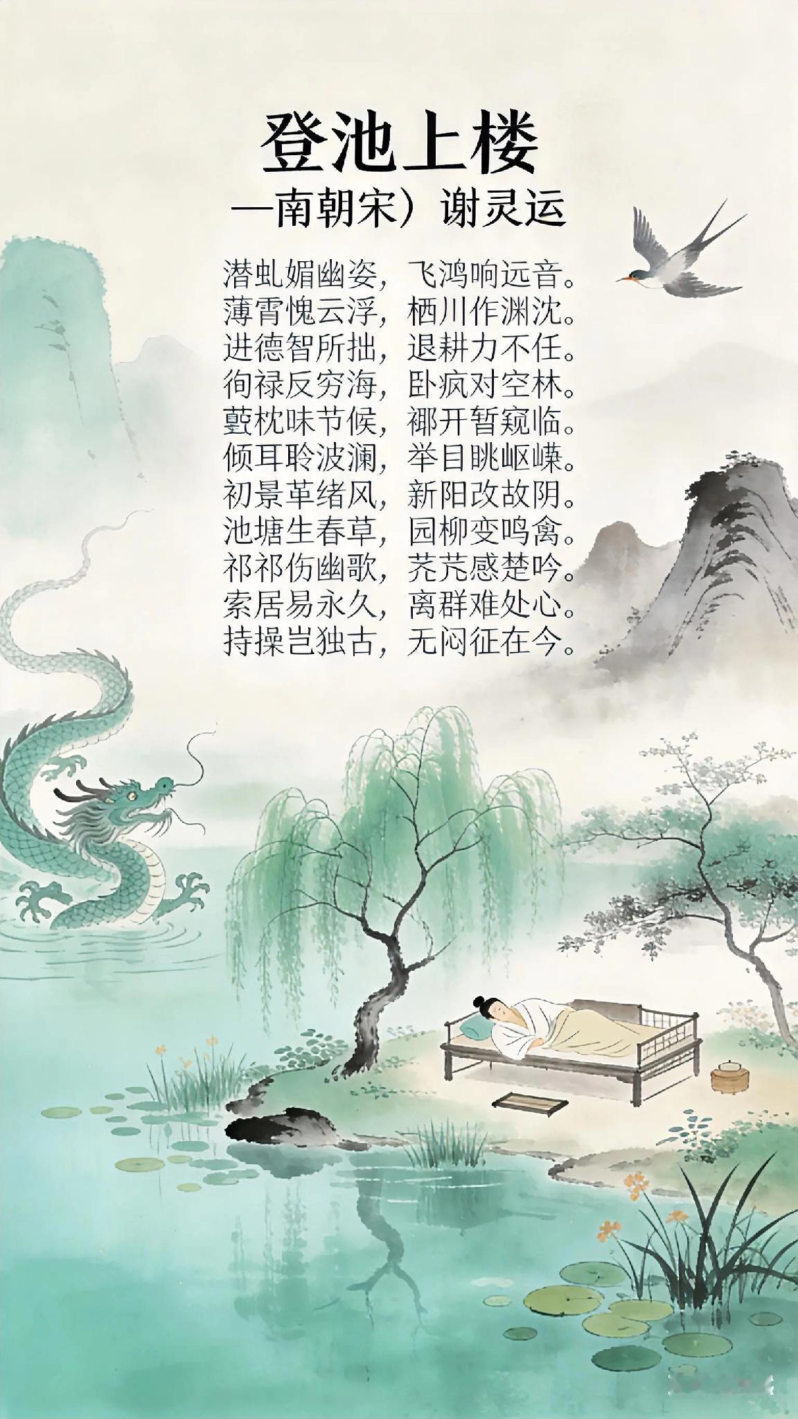 《登池上楼》南朝宋、谢灵运。 潜虬媚幽姿, 飞鸿响远音。 薄霄愧云浮, 栖川作渊沈。 进德智所拙, 退耕力不任。 徇禄反穷海, 卧疴对空林。 衾枕昧节候, 褰开暂窥临。 倾耳聆波澜, 举目眺岖嵚。 初景革绪风, 新阳改故阴。 池塘生春草, 园柳变鸣禽。 祁祁伤幽歌, 萋萋感楚吟。 索居易永久, 离群难处心。 持操岂独古, 无闷征在今。 《登池上楼》现译: 幽潭中的虬龙自赏身姿,高飞的鸿雁鸣声远扬。 我既惭愧不能如鸿雁直上云霄,又羡慕虬龙深潜的从容。 求取功名非我所长,归隐耕作又力不从心。 为求俸禄来到这偏远海滨,病中独对萧瑟山林。 久卧不知季节变换,今日推窗眺望——侧耳听见浪涛轻响,抬眼望见山峦叠嶂。 初春驱散了残冬寒风,新生取代了旧日阴霾。 池塘边春草悄然萌发,柳枝间换了啼鸟新声。 眼前春色让我想起《豳风》《楚辞》的感伤,独居方觉时光漫长,离群更觉心神难安。 但坚守节操岂止古人能做到?“遁世无闷”的境界,今日我也能抵达。 古诗词 你记得最深的一首古诗词是什么 你最喜欢的一句古诗词是什么 诗词歌赋 诗词歌赋交流天地 绿水青山伴词诗 上古诗鉴赏