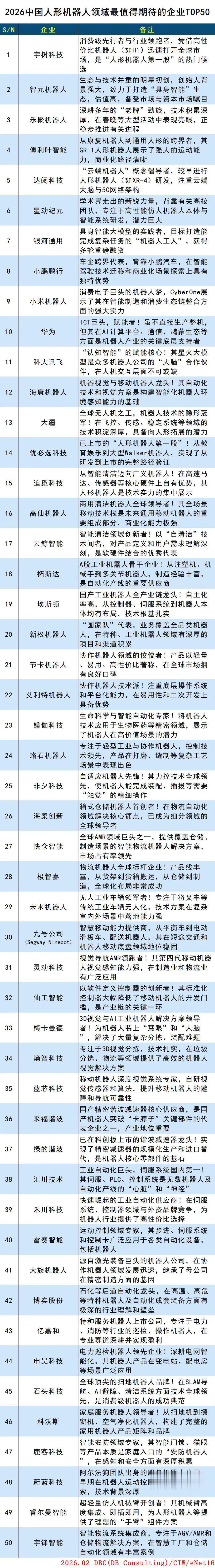 产业处于爆发前夜,有哪些趋势值得关注?四川有何发展机遇?近日,德本咨询、雨前顾问接连发布“2026中国人形机器人领域最值得期待的企业TOP50”“2025中国人形机器人企业竞争力TOP50”榜单,透过这两份榜单,我们可以看到哪些产业发展的新信号?