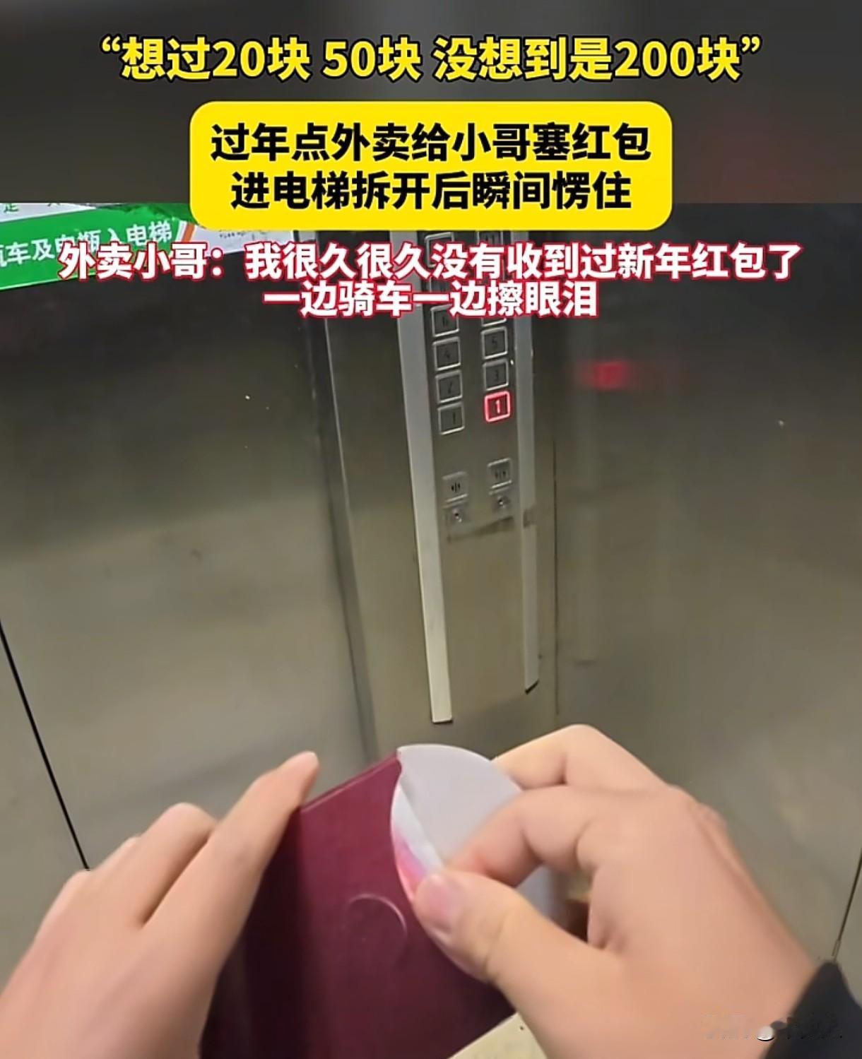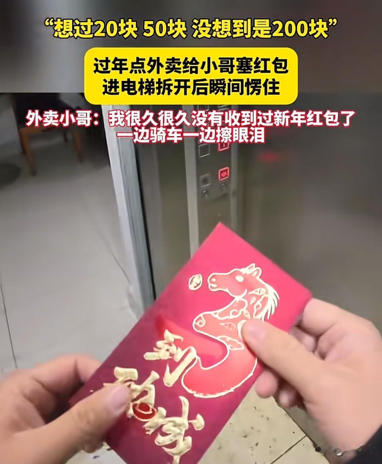 “看哭了!”江苏,外卖小哥大年初一去送外卖,外卖送到后,顾客塞给小哥一个红包,小哥想过里面可能是20、50,可他拆开红包后,当场愣住原地,随后红了眼眶。 大年初一,当大家还沉浸在团圆的喜悦中时,外卖小哥阿生(化名)却早早出了门,开始接单送外卖。 他骑着电动车,穿梭在大街小巷,很快就来到了一个小区,按照订单地址,他找到了客户家门口,轻轻敲了敲门。 门开了,一位女子出现在门口,接过了阿生手中的外卖。 随后,女子转身回到屋里,拿出一个红包,塞到阿生手里,说:新年第一天,给你一个红包。 阿生急忙摆手,说:“不用不用不用……” 可女子很坚持,还追了出来,阿生心里一阵感动,道了谢,收下了红包。 这时,阿生看到女子家门口放着一些垃 圾,便问:需要帮忙提下去吗? 女子说不用后,阿生进了电梯,按了楼层。 随后他在电梯里拆开了那个红包,他想过里面可能是20、50的,可当他看到里面整整有200元时,他愣在了原地,紧接着,眼眶就红了。 在回去的路上,阿生一边骑着电动车,一边忍不住落泪。 在这个寒冷的冬天,他感受到了前所未有的温暖。 大家纷纷感叹,过年时遇到这样暖心的顾客,真是幸运。 有人说:如果这不是段子,这种小区的顾客能给200元红包,真的很善良了。 也有广东的网友说:过年叫外卖,都会给小哥一个红包,在广东叫利是,里面就5块钱,不知道会不会被嫌弃? 有网友评论说:不会嫌弃,多少都是心意,主打喜庆,如果收到,也会开心一整天。 顾客在大年初一给外卖小哥红包,是一种善意的表达,是对他们辛苦工作的认可和感谢,这份红包承载着顾客的心意和温暖。 也有人调侃,如果顾客事后反悔索要,还能把红包要回去吗? 顾客给外卖小哥红包,是一种无偿赠与行为。 《民法典》第658条规定:赠与人在赠与财产的权利转移之前可以撤销赠与。 顾客主动将红包塞给外卖小哥,外卖小哥也接受了,这就意味着赠与合同已经成立并生效。 一旦赠与完成,非因法定情形,赠与人不得随意撤销赠与。所以,顾客不能随意要回这笔钱。 大年初一的红包,寓意着吉祥、好运和祝福,也是温暖和善意的象征,外卖小哥可以安心收下。 对于此事,大家怎么看?过年期间,你会给陌生人红包吗?