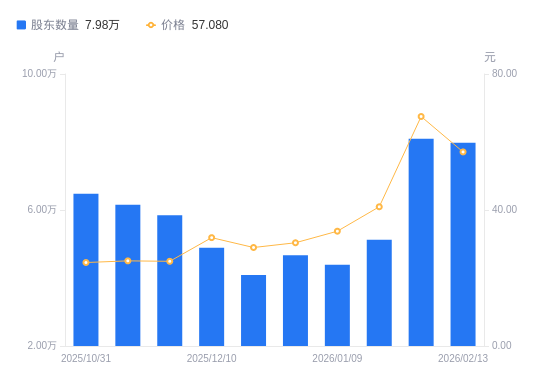 日期A股户数(户)流通A股户均持股数(股)户均持股市值(万元)2026-02-13797662929.3116.722026-01-30809652885.9319.482026-01-20512504559.2018.672026-01-09438985322.7817.972025-12-31466935004.1615.192025-12-19408985713.2216.552025-12-10488804780.2615.232025-11-28584213999.589.962025-11-10615613795.579.502025-10-31647743607.308.86
