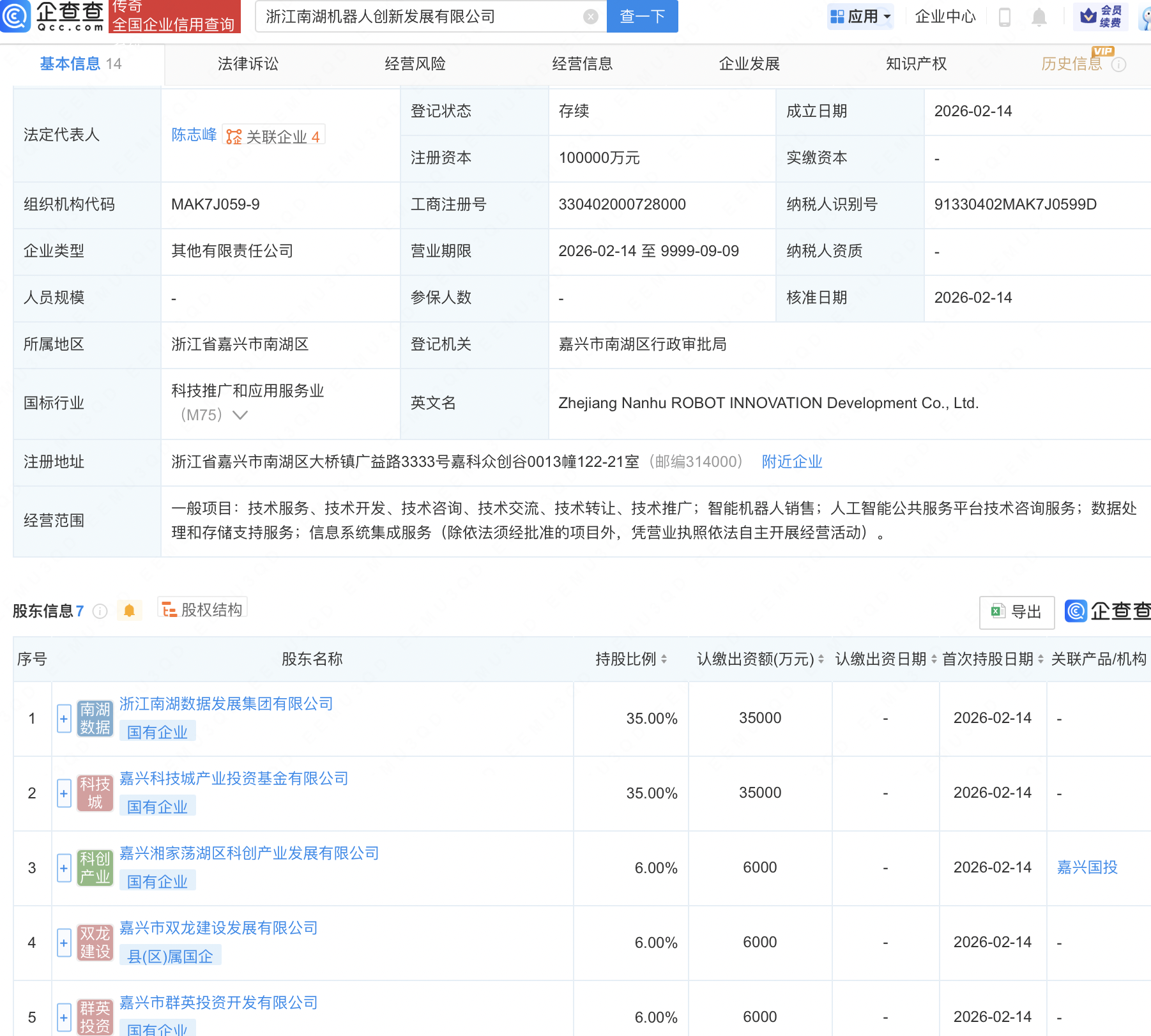 企查查APP显示,近日,浙江南湖机器人创新发展有限公司成立,注册资本10亿元,经营范围包含:智能机器人销售;人工智能公共服务平台技术咨询服务;数据处理和存储支持服务等。企查查股权穿透显示,该公司由浙江南湖数据发展集团有限公司等共同持股。