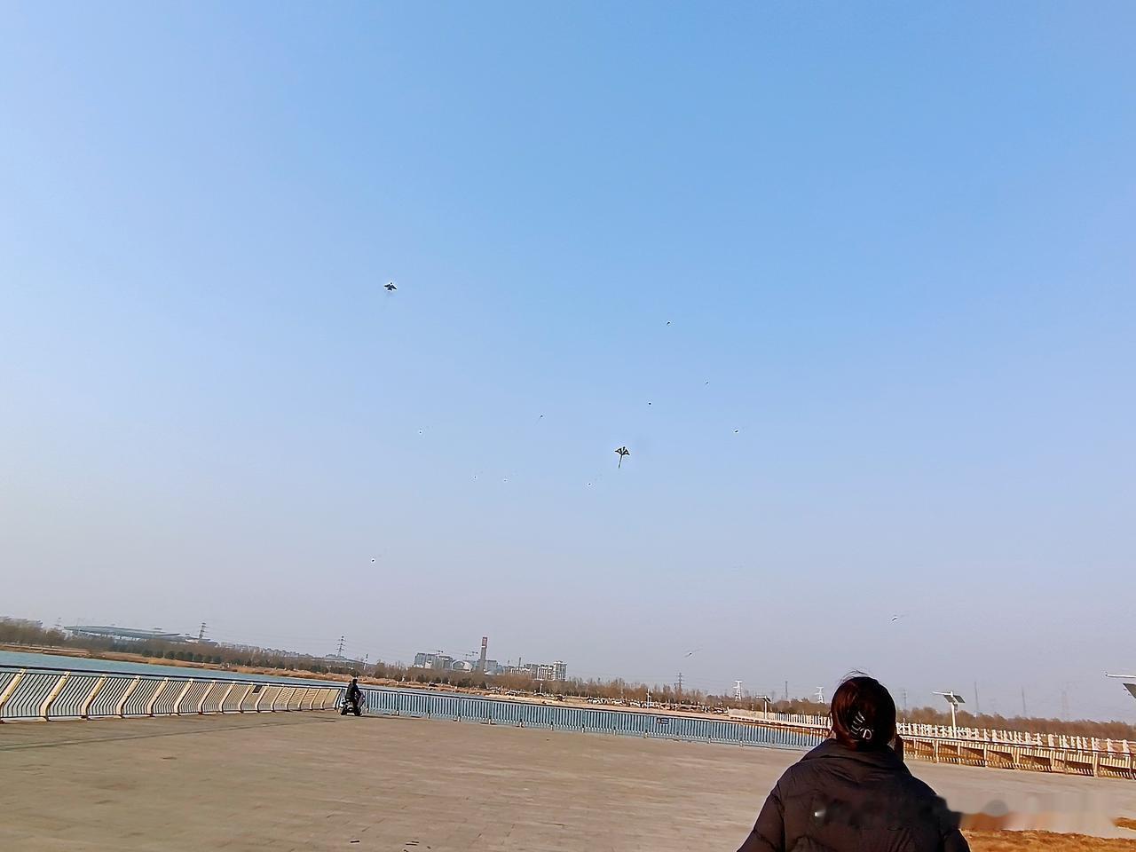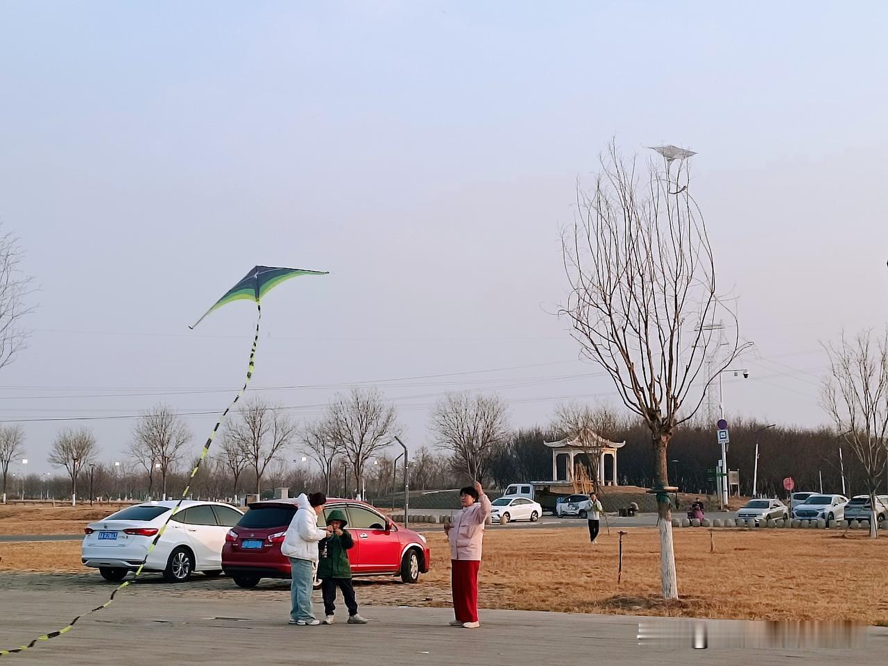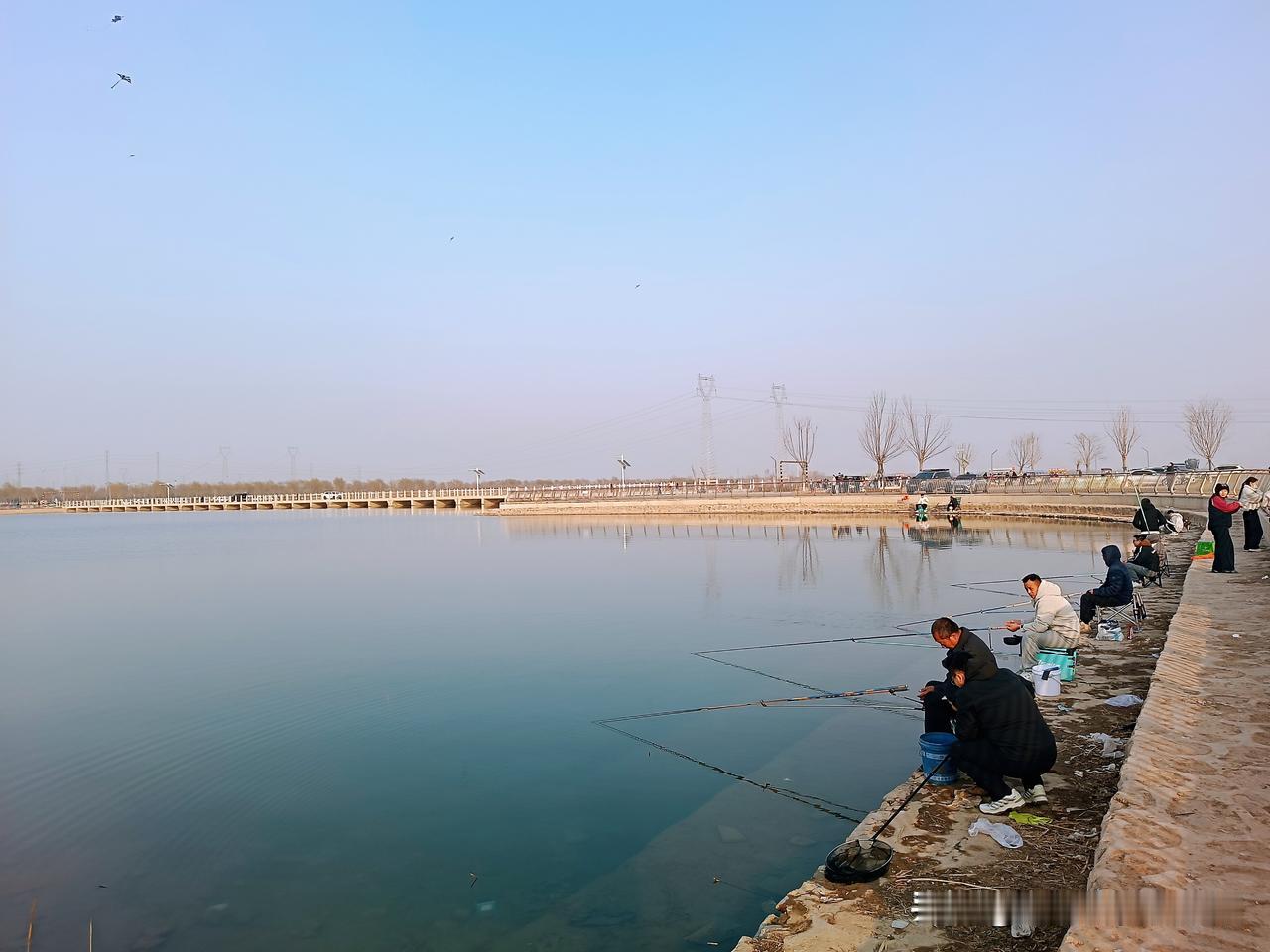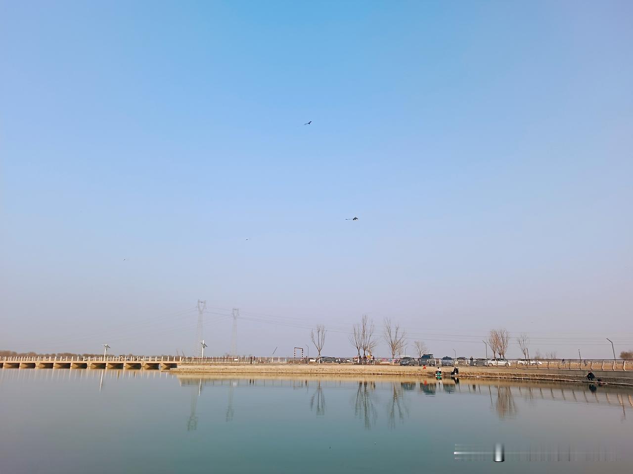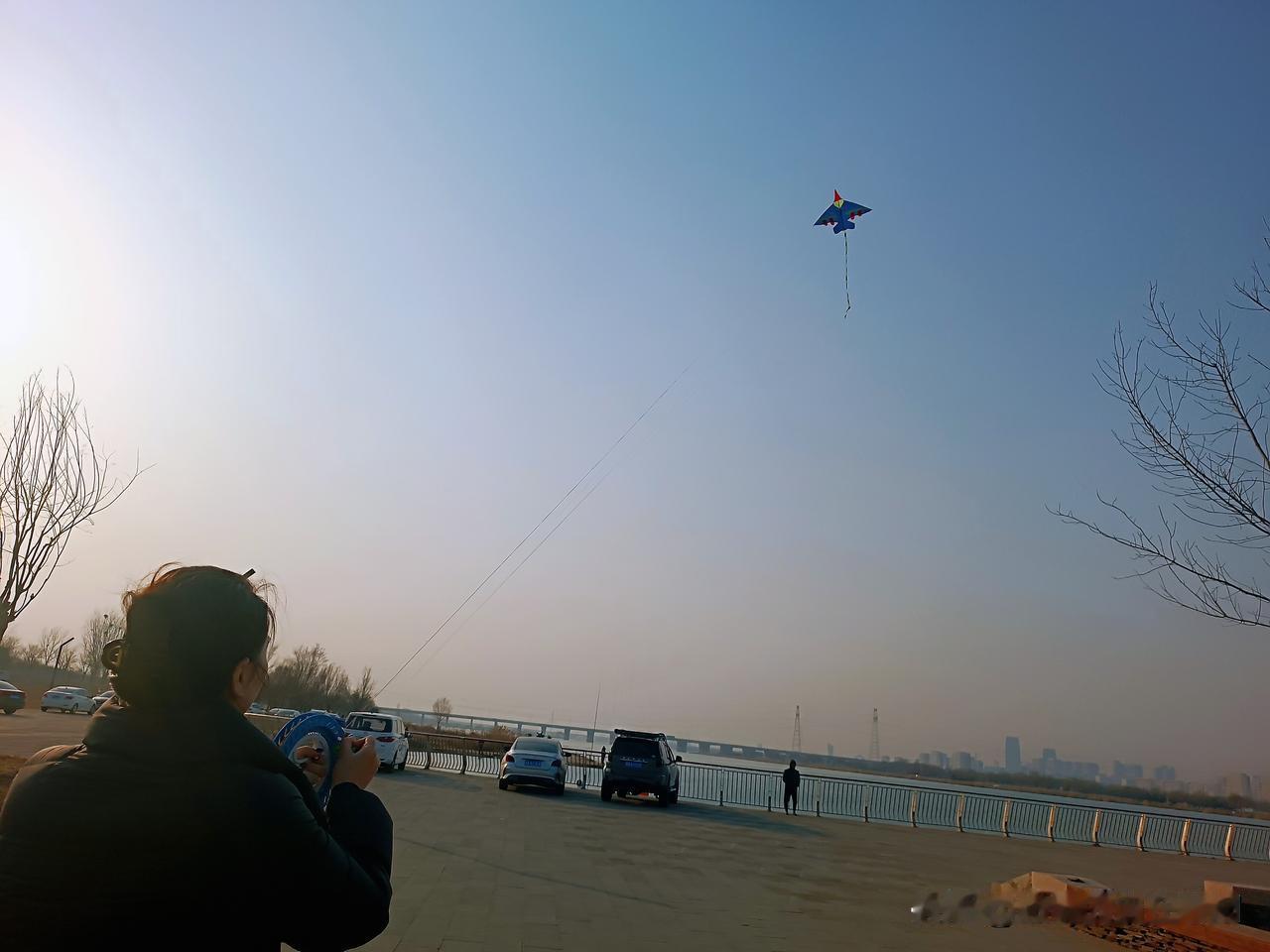 正月初八,我们第N次到滹沱河边遛娃啦。 “放风筝吧!”我们花50块钱买了个飞机风筝,这风筝瞬间成了今日主角。孙子年纪小,握不住线轴,儿媳便接过了这份快乐。周围都是家长陪着孩子放风筝,大家笑着,跑着,此刻谁不是追逐着风的孩子呢? 儿子带着孙子又被钓鱼的吸引过去,蹲在河边看别人钓鱼。小家伙被深深吸引,谁劝都不肯挪步,这么小的孩子竟也有钓鱼的乐趣? 风突然变小,儿媳没来得及收线,“飞机”直接掉进滹沱河。她手忙脚乱地拽,钓鱼的人也过来帮忙。风筝弄上岸时已沾了水汽,儿媳笑着把它挂在栏杆上晾晒,这小插曲倒增添了别样意趣。 对面一家六口在打羽毛球,欢声笑语随风飘散。不远处,一辆白色的车静静停着,暖阳洒在上面,岁月无比静好。 清澈河水倒映着蓝天,风筝在云端摇曳,钓鱼的人在岸边静静守候。原来,美就藏在滹沱河的波光中、家人的笑容里,还有这平凡的春日里。