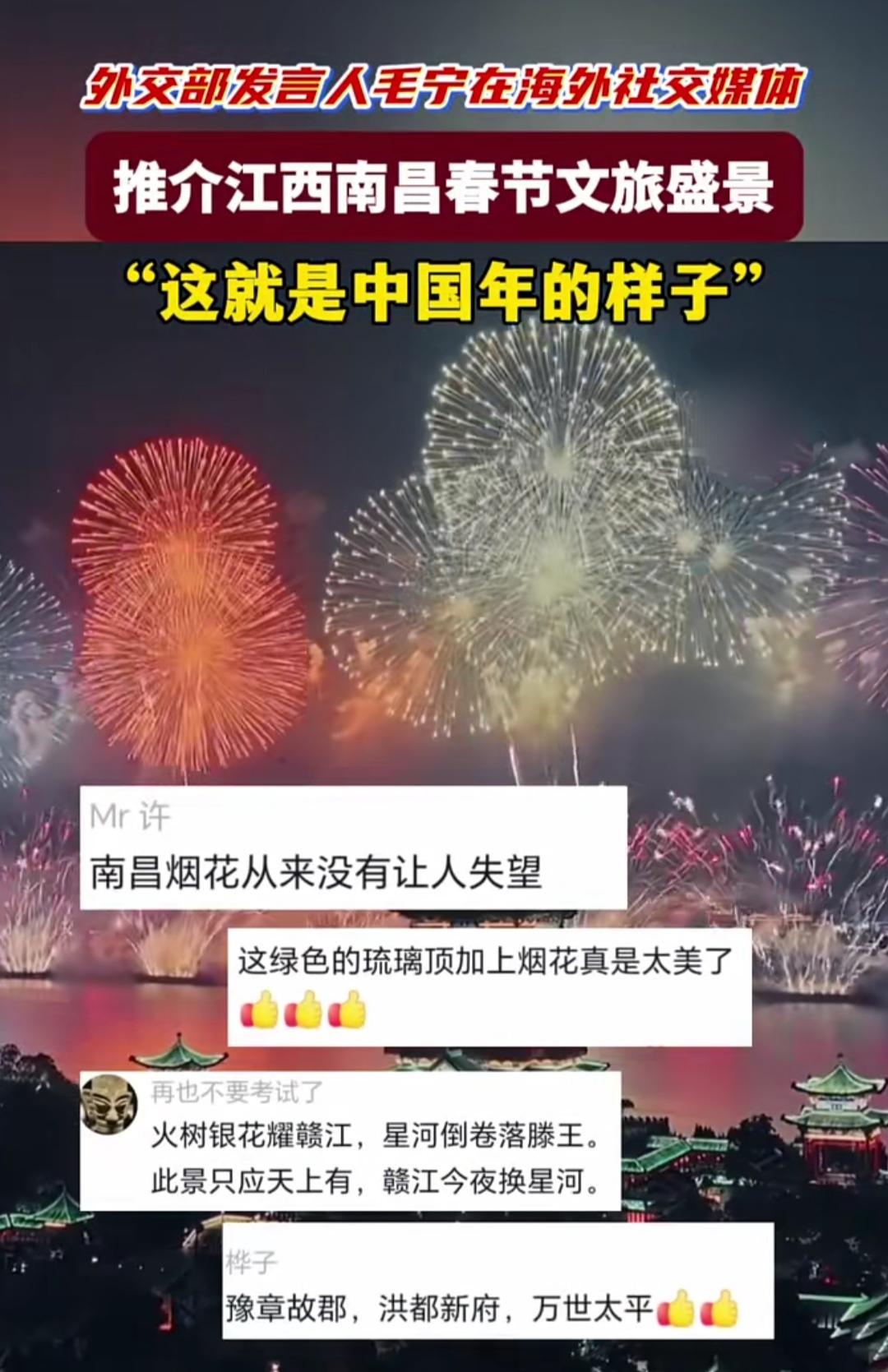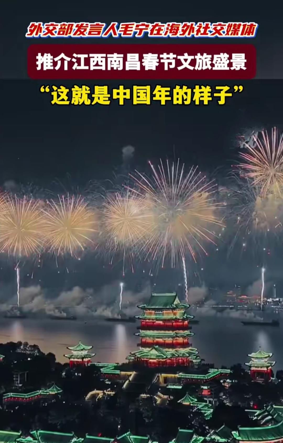 谁能拒绝这样的中国年!外交部发言人毛宁在海外社交平台安利南昌的春节盛景,直接把中国年味送到了全世界,这波文化输出真的太戳心,隔着屏幕都能感受到满满的热闹与温情。 这次被推介的南昌新春,藏着最地道的中国年味儿。赣江两岸的迎春烟花晚会惊艳亮相,还首次开启全球直播,用双语讲述南昌的新春故事,滕王阁的夜游美景更是跻身全国前十,氛围感直接拉满。 为了迎接新春,南昌备足了诚意,以“南昌邀您来过年”为主题推出300余项特色活动。万寿宫等街区的民俗活动热热闹闹,历史、红色与潮流元素完美融合,让各地游客都能沉浸式感受不一样的新春氛围。 一桌家乡菜,一场烟花秀,一方民俗景,这就是最真实的中国年。南昌的新春盛景走出国门,让世界看见中国春节的独特魅力,也让每个中国人都心生自豪,这藏在烟火气里的年味,永远最动人。