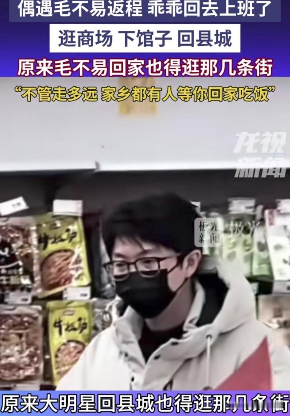 有网友在候机时碰到了毛不易, 还要他的家乡齐齐哈尔, 也有粉丝表示在泰来县逛商场也碰到了他,甚至有人在饭馆吃饭,也碰到了他, 大家纷纷调侃, 原来大明星回家也逛这几条街, 他和普通人一样年过完了也要回去上班, 有人调侃毛不易, 不管走多远, 家乡都有人等你回去吃年夜饭!