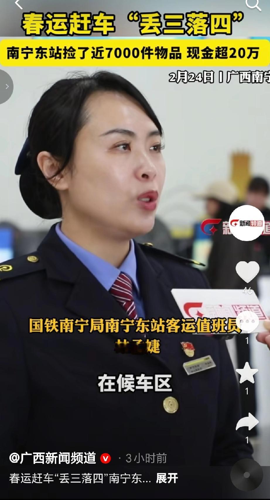 南宁东站因春运期间旅客赶车粗心“丢三落四”,站内民警高明伟在客运执勤11年间,累计为旅客寻回遗失物品超7000件,挽回经济损失近千万元,他也被旅客称作“寻包达人” 。2026年春运期间,南宁东站遗失物品现象仍高发,仅身份证日均登记遗失量就超百张,安检口、闸机读卡区、候车座位等是物品遗失高发区域 。车站也给出遗失物品补救办法:可前往服务台/民警处登记,或通过铁路12306App“遗失物品查找”功能报备;若身份证丢失需乘车,可在12306App申请24小时内有效的电子临时身份证明 。(来源于@广西新闻频道 )