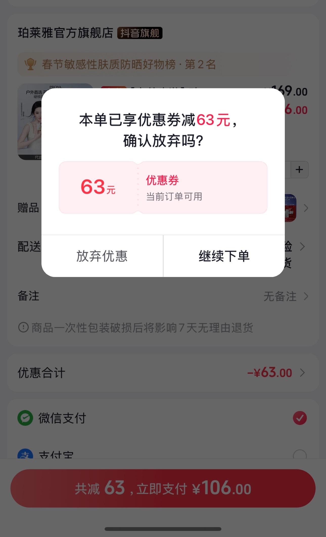 在我孜孜不倦的努力下终于刷到了平台给的大额优惠券从169→164→150最后106拿下珀莱雅防晒嘻嘻跟客服确认了一下 天仙的小卡也有满足了满足了 等收货~