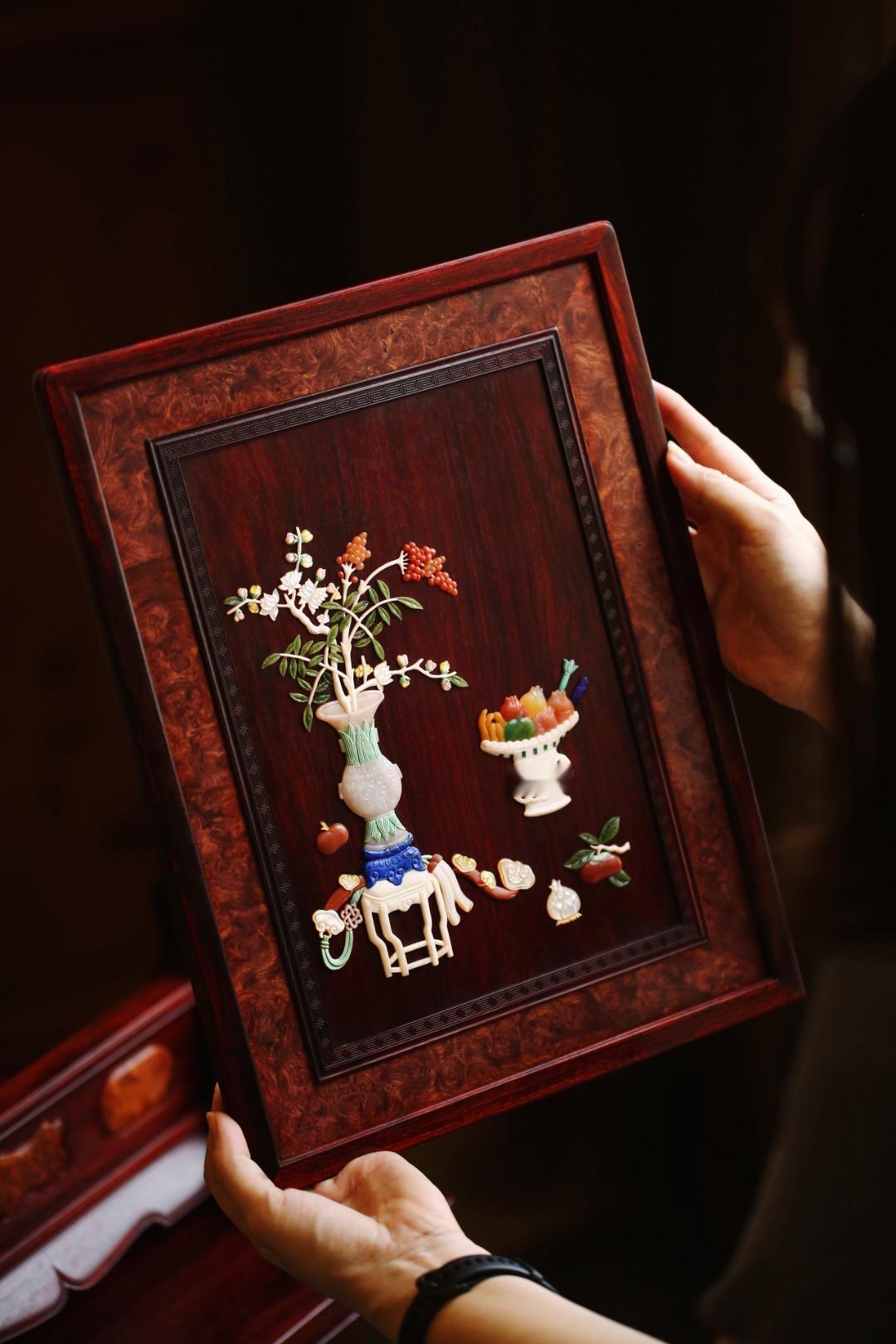 小叶紫檀攒框镶缅花瘤疤屏心百宝嵌清供图,配色典雅,寓意多子多福;置案清赏,添祥和雅意。