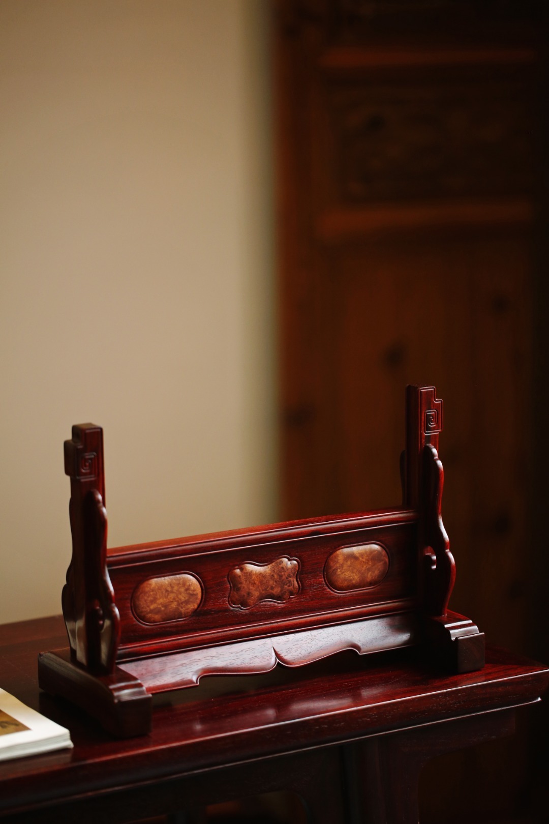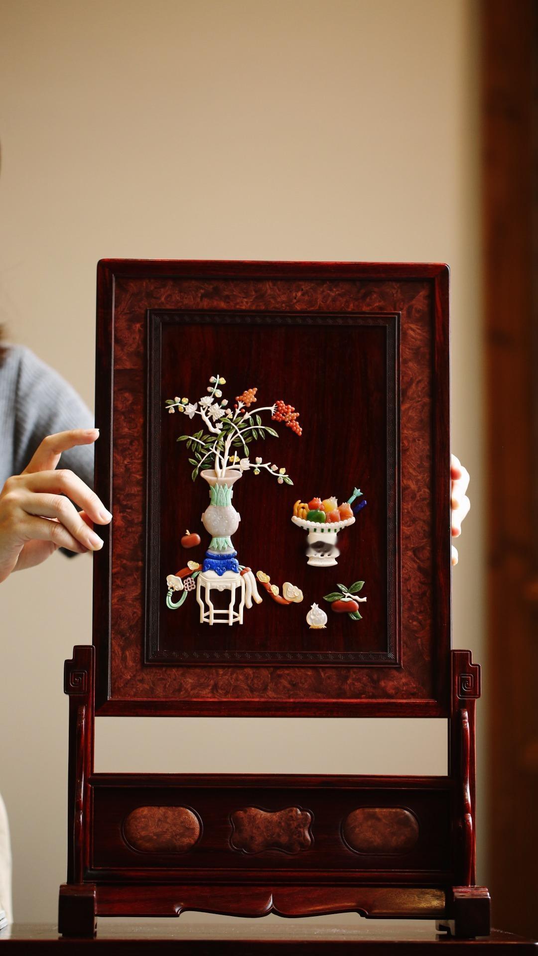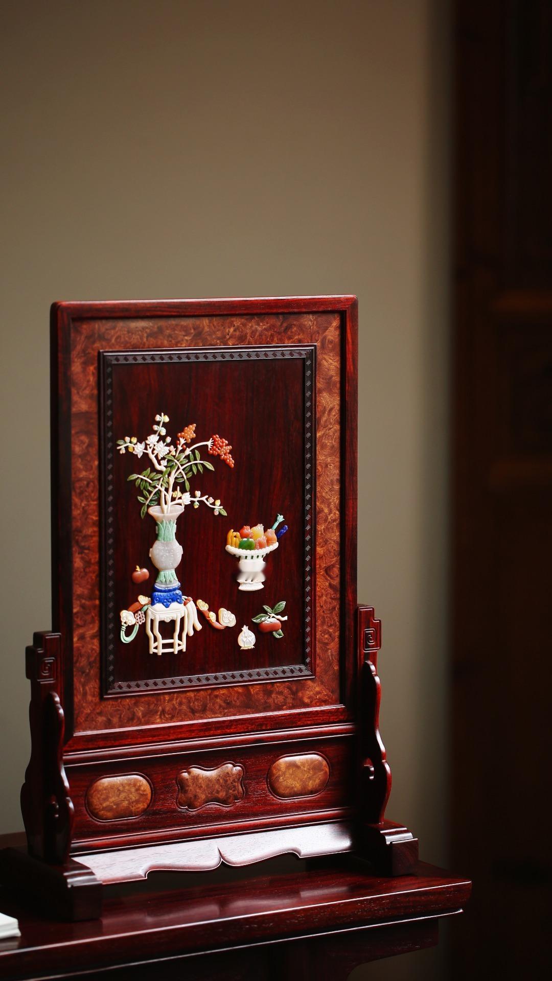 小叶紫檀×百宝嵌 | 清供图 插屏小叶紫檀攒框镶缅花瘤疤屏心百宝嵌清供图,配色典