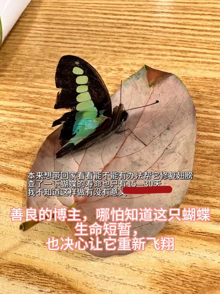 治好了一个蝴蝶谁在乎?蝴蝶在乎。 粉毛吃瓜喵。 事情的起因是一博主捡到一只残缺的蝴蝶,善良的博主哪怕知道这只蝴蝶生命短暂,也决心让它重新飞翔。尝试用树叶做翅膀不成功后又多次尝试了羽毛,翅膀成功补好后博主带着蝴蝶反复练习飞行。第二天阳光明媚,修补过的翅膀真的带着蝴蝶飞向天空。看到成功挥翅的蝴蝶博主万分欣喜,但是还忍不住托举。 给蝴蝶做翅膀简直是闻所未闻的事,值得吗?这只蝴蝶在乎的话就是值得的。从此以后蝴蝶界流传了一个蝴蝶医生能造翅膀的传说。