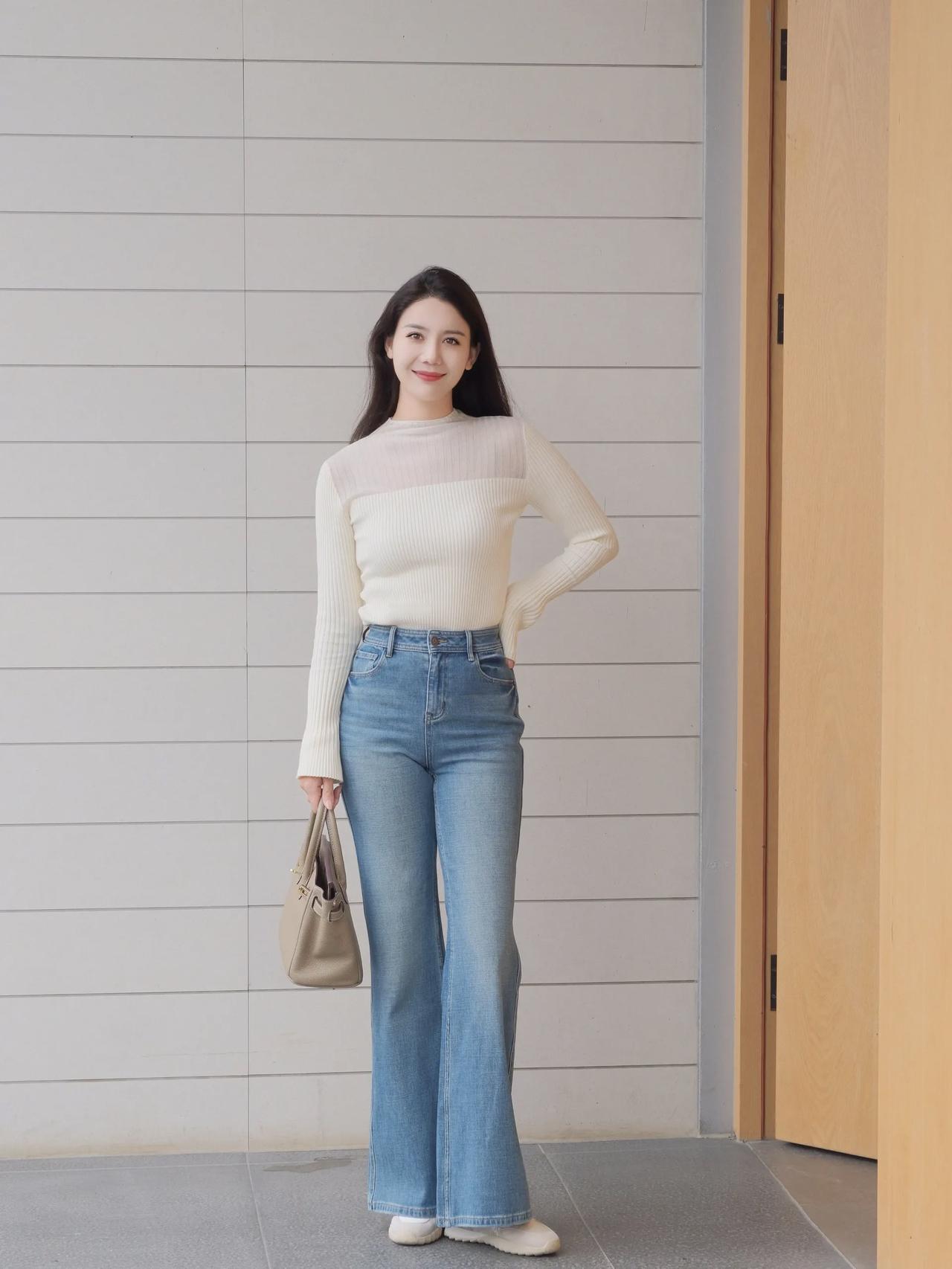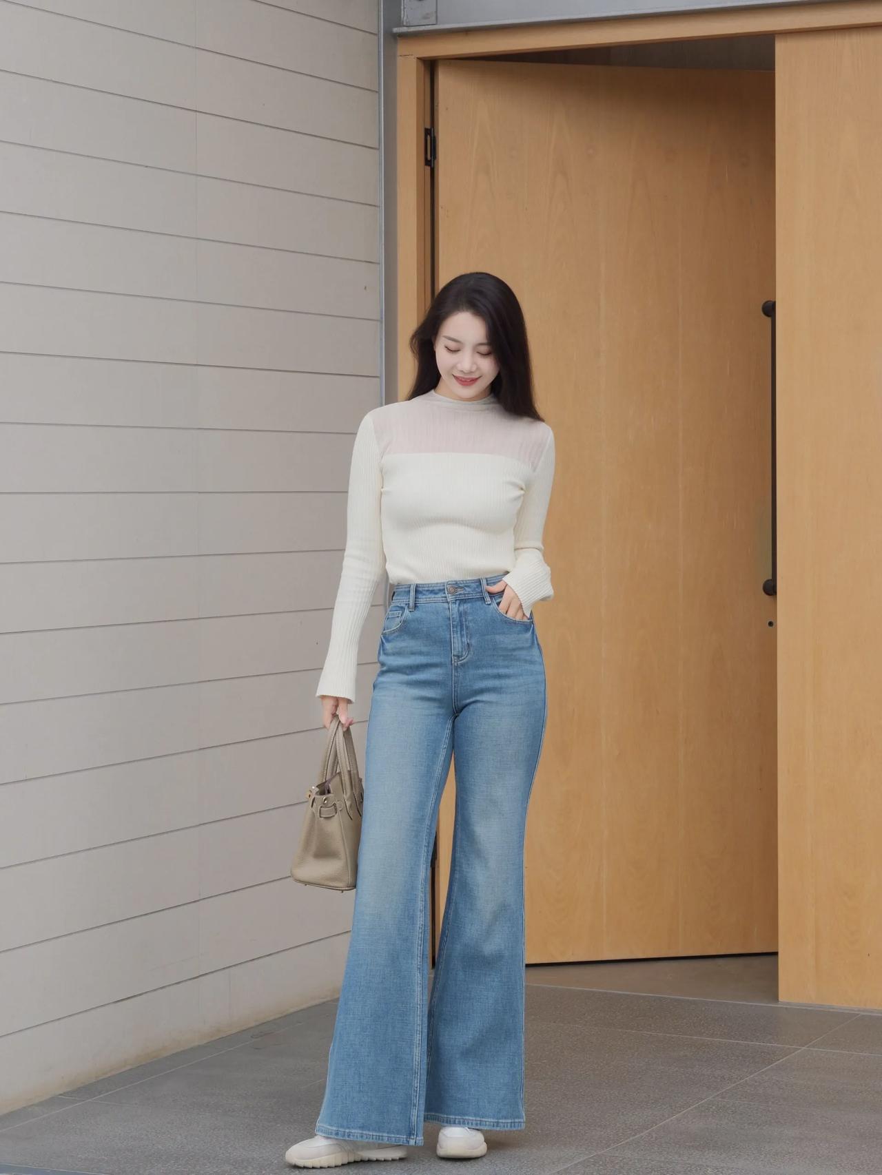 春日微喇牛仔裤穿搭,绝了!简约精致又时髦。白色荷叶边背心,配复古微喇牛仔