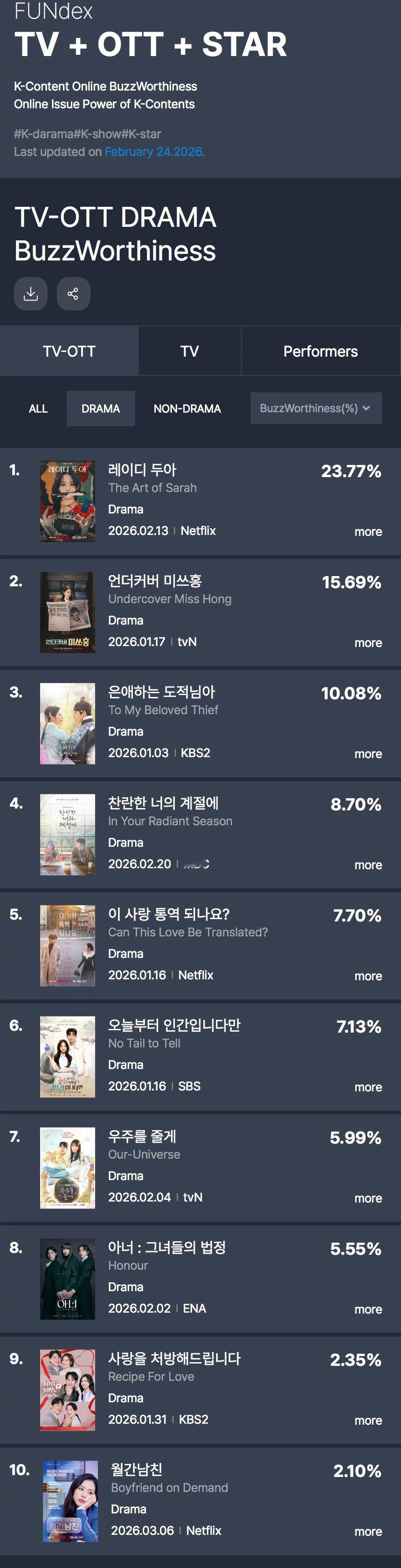GOODDATA公布2026年2月第3周TV-OTT热度话题性排行。1.莎拉的真伪人生 23.77%2.韩剧卧底洪小姐 15.69%3.韩剧恩爱的盗贼大人 10.08%4.韩剧在你灿烂的季节 5.爱情怎么翻译 6.今天开始是人类 7.韩剧给你宇宙 8.荣耀:她们的法庭 9.爱情处方签 10.订阅男友